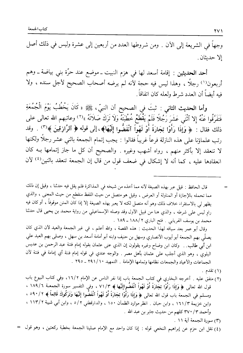 وأما الحديث الثاني. ثبتَ في الصحيح أن النبيّ، - صلى الله عليه وسلم - "كَانَ يَخْطُبُ يَوْمَ الْجُمُعَةِ فَتَفَرَّقُوا عَنْهُ إِلا اثْنَي عَشَرَ رَجُلًا فَلَمْ يَقْطَع خُطْبَتَهُ وَلَا تَرَكَ صَلاَتَهُ" (¬2) وعاتبهم الله تعالى على ذلك فقال: {وَإِذَا رَأَوْا تِجَارَةً أَوْ لَهْوًا انْفَضُّوا إِلَيْهَا}، إلى قوله {الرَّازِقِينَ} (¬3). وقد رتب علماؤنا على هذه النازلة فرعاً غريباً فقالوا: يجب إتمام الجمعة باثني عشر رجلًا ولكنها لا تنعقد إلا بأكثر منهم، رواه أشهب وغيره. والصحيح أن كل ما جاز إتمامها به كان انعقادها عليه، كما أنه لا إشكال في ضعف قول من قال إن الجمعة تنعقد باثنين (¬4) لأن
