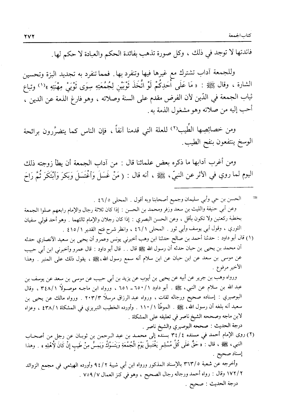 (¬2) روى الإِمام أحمد في مسنده 4/ 34 بسنده إلى محمد بن عبد الرحمن بن ثوبان عن رجل من أصحاب النبي، - صلى الله عليه وسلم -، قال: "حَقٌّ عَلَى كُل مُسْلِمٍ يَغْتَسِلُ يَوْمَ الْجُمُعَةِ وَيتَسَوَّكُ وَيمِسُّ مِنْ طَيبٍ إِنْ كَان لأهْلِهِ". وهذا إسناد صحيح.