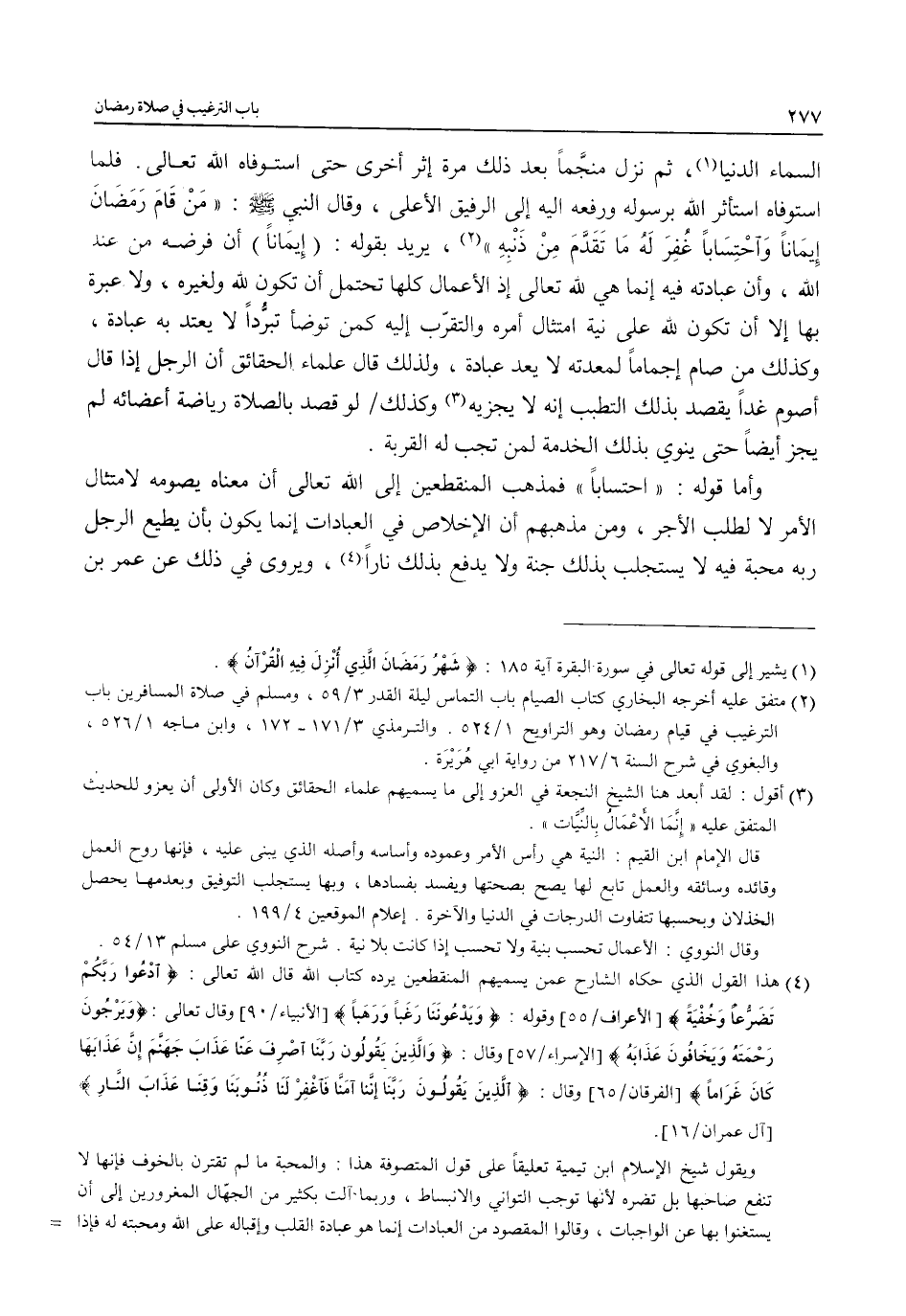 السماء الدنيا (¬1)، ثم نزل منجَّمًا بعد ذلك مرة إثر أخرى حتى استوفاه الله تعالى. فلما استوفاه استأثر الله برسول ورفعه إليه إلى الرفيق الأعلى، وقال النبي - صلى الله عليه وسلم -: "مَنْ قَامَ رَمضانَ إِيمَانًا وَاحْتِسَابًا غُفِرَ لَهُ مَا تَقَدَّمَ مِنْ ذَنْبِهِ" (¬2)، يريد بقوله: (إِيمَانًا) أن فرضه من عند الله، وأن عبادته فيه إنما هي لله تعالى إذ الأعمال كلها تحتمل أن تكون لله ولغيره، ولا عبرة بها إلا أن تكون لله على نية امتثال أمره والتقرّب إليه كمن توضأ تبرُّدًا لا يعتد به عبادة، وكذلك من صام إجمامًا لمعدته لا يعد عبادة، ولذلك قال علماء الحقائق أن الرجل إذا قال أصوم غدًا يقصد بذلك التطبب إنه لا يجزيه (¬3) وكذلك لو قصد بالصلاة رياضة أعضائه لم يجز أيضًا حتى ينوي بذلك الخدمة لمن تجب له القربة.