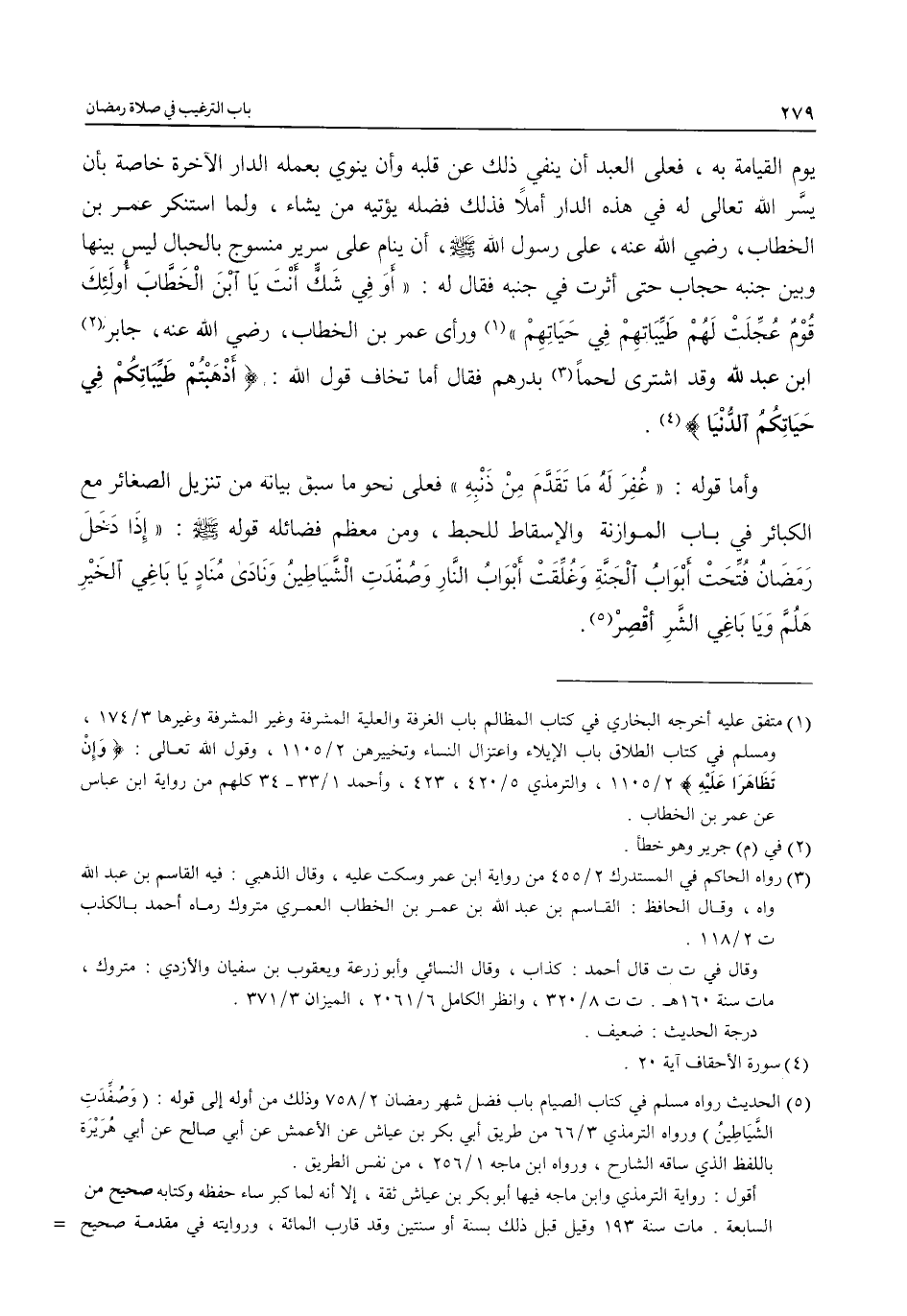 (¬3) رواه الحاكم في المستدرك 2/ 455 من رواية ابن عمر وسكت عليه، وقال الذهبي: فيه القاسم بن عبد الله واه، وقال الحافظ: القاسم بن عبد الله بن عمر بن الخطاب العمري متروك رماه أحمد بالكذب ت 2/ 118.