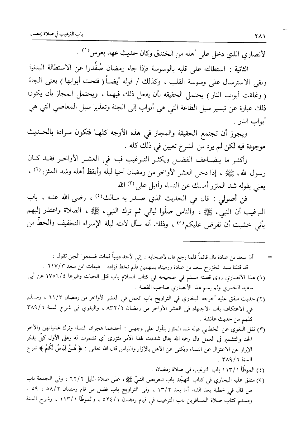 (¬5) متفق عليه البخاري في كتاب التهجّد باب تحريض النبي - صلى الله عليه وسلم -، على صلاة الليل 2/ 62، وفي الجمعة باب من قال في خطبة بعد الثناء أما بعد 2/ 13، وفي التراويح باب فضل من قام رمضان 2/ 58، 59، ومسلم كتاب صلاة المسافرين باب الترغيب في قيام رمضان 1/ 524، والموطّأ 1/ 113، وشرح السنة