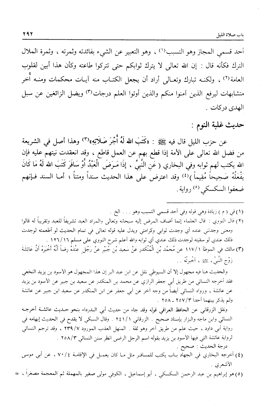 عن حزب الليل قال فيه - صلى الله عليه وسلم -: "كَتَبَ الله لَهُ أَجْرَ صَلَاتِهِ" (3) وهذا أصل في الشريعة من فضل الله تعالى على الأمة إذا قطع بهم عن العمل قاطع، وقد انعقدت نيتهم عليه فإن الله يكتب لهم ثوابه وفي البخاري (عَنِ النَّبِيِّ، إذَا مَرَضَ الْعَبْدُ أَوْ سَافَرَ كَتَبَ الله لَهُ مَا كَانَ يفْعَلُهُ صَحِيحًا مُقِيمًا) (¬4) وقد اعترض على هذا الحديث سندًا ومتنًا؛ أما السند فإنهم ضعفوا السكسكي (¬5) رواية.