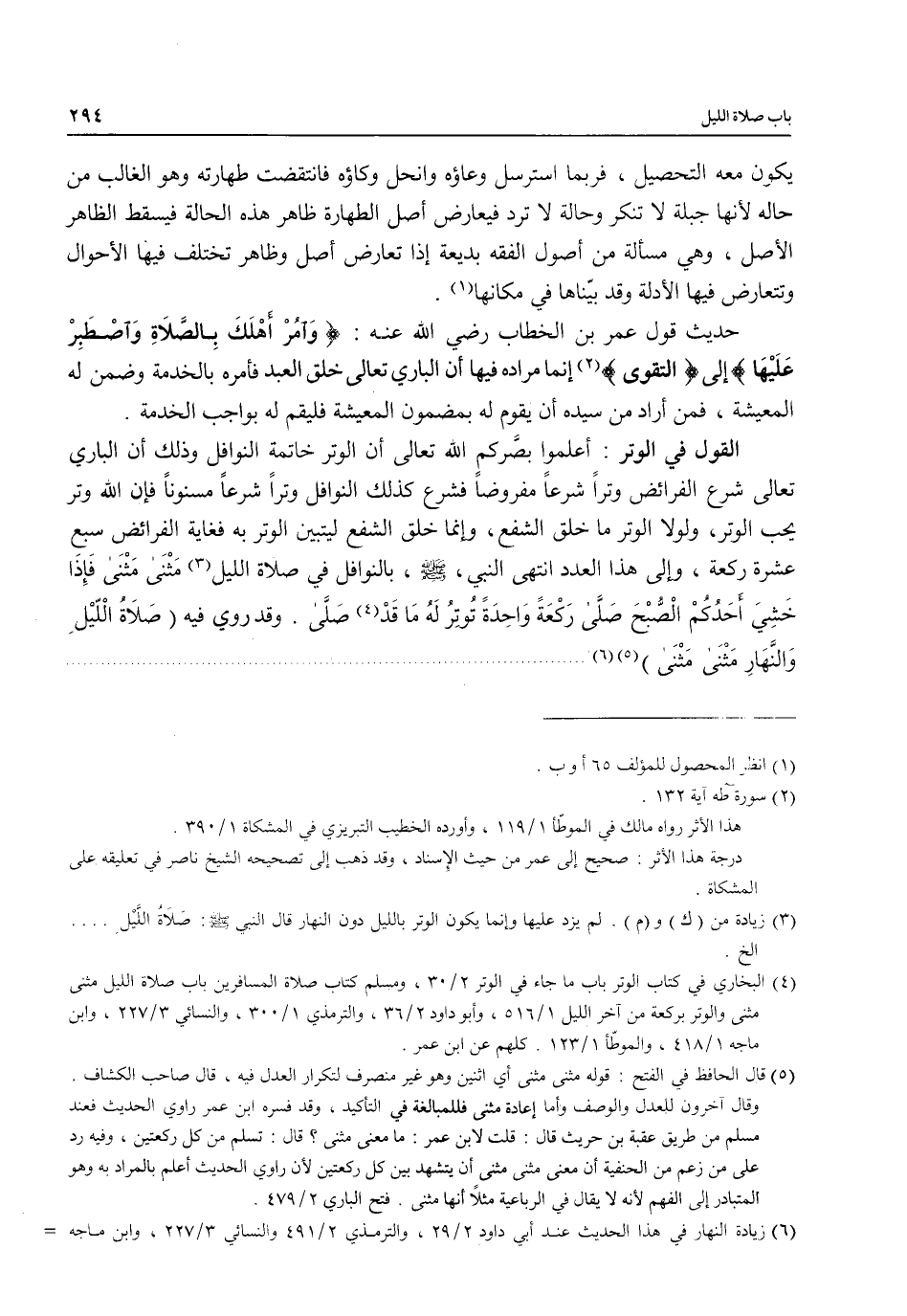 (¬4) البخاري في كتاب الوتر باب ما جاء في الوتر 2/ 30، ومسلم كتاب صلاة المسافرين باب صلاة الليل مثنى مثنى والوتر بركعة من آخر الليل 1/ 516، وأبو داود 2/ 36، والترمذي 1/ 300، والنسائي 3/ 227، وابن ماجه 1/ 418، والموطّأ 1/ 123. كلهم عن ابن عمر.