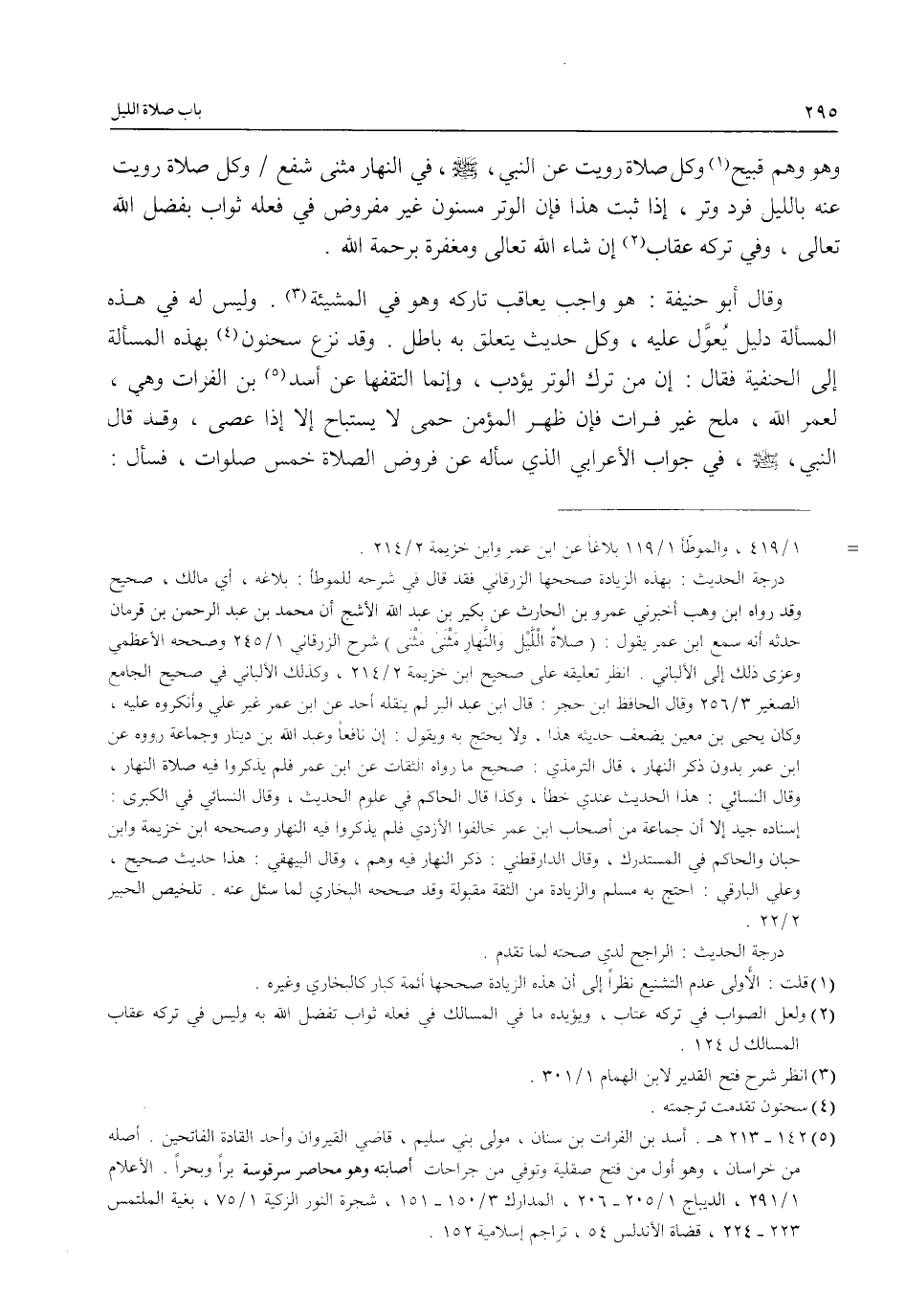 وهو وهم قبيح (¬1) وكل صلاة رويت عن النبي، - صلى الله عليه وسلم -، في النهار مثنى شفع وكل صلاة رويت عنه بالليل فرد وتر، إذا ثبت هذا فإن الوتر مسنون غير مفروض في فعله ثواب بفضل الله تعالى، وفي تركه عقاب (¬2) إن شاء الله تعالى ومغفرة برحمة الله.