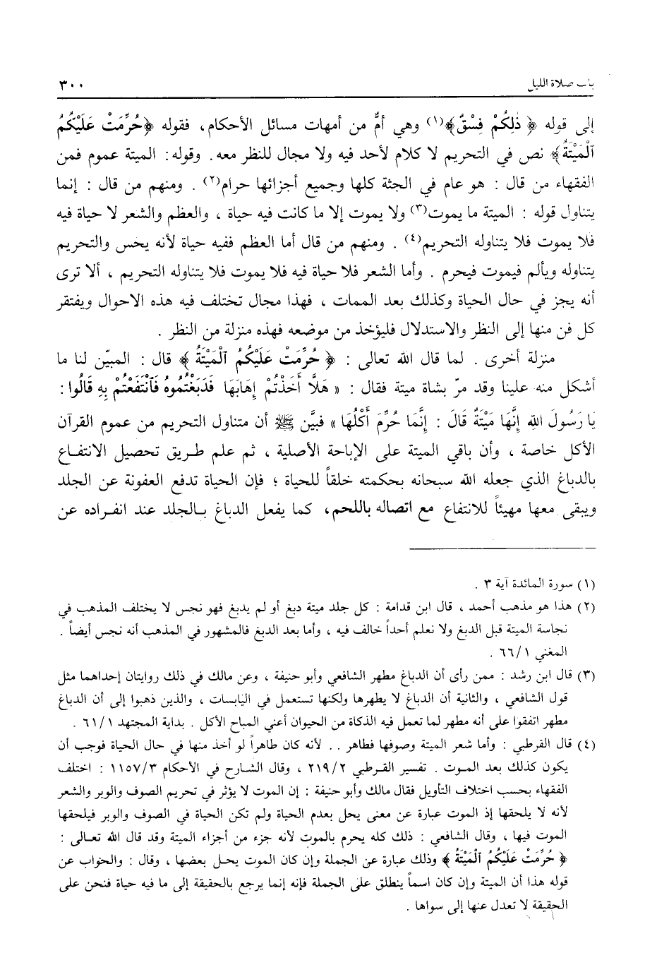 (¬4) قال القرطبي: وأما شعر الميتة وصوفها فطاهر .. لأنه كان طاهرًا لو أخذ منها في حال الحياة فوجب أن يكون كذلك بعد الموت. تفسير القرطبي 2/ 219، وقال الشارح في الأحكام 3/ 1157: اختلف الفقهاء بحسب اختلاف التأويل فقال مالك وأبو حنيفة: إن الموت لا يؤثر في تحريم الصوف والوبر والشعر لأنه لا يلحقها إذ الموت عبارة عن معنى يحل بعدم الحياة ولم تكن الحياة في الصوف والوبر فيلحقها الموت فيها، وقال الشافعي: ذلك كله يحرم بالموت لأنه جزء من أجزاء الميتة وقد قال الله تعالى: {حُرِّمَتْ عَلَيْكُمُ الْمَيْتَةُ} وذلك عبارة عن الجملة وإن كان الموت يحل بعضها، وقال: والجواب عن قوله هذا أن الميتة وإن كان اسمًا ينطلق على الجملة فإنه إنما يرجع بالحقيقة إلى ما فيه حياة فنحن على الحقيقة لا تعدل عنها إلى سواها.
