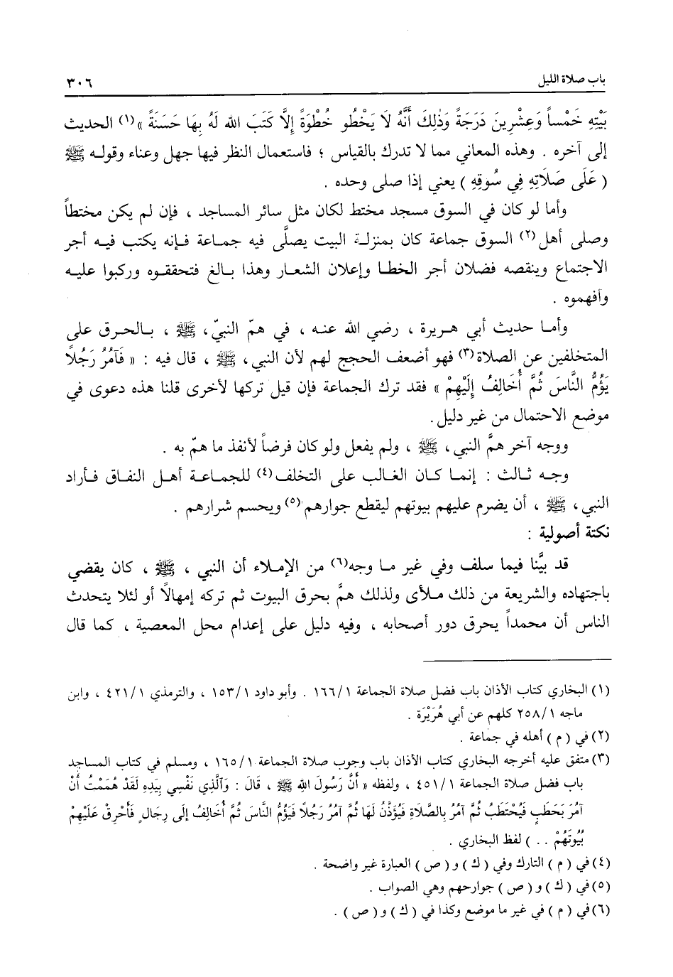 (¬3) متفق عليه أخرجه البخاري كتاب الأذان باب وجوب صلاة الجماعة 1/ 165، ومسلم في كتاب المساجد باب فضل صلاة الجماعة 1/ 451، ولفظه "أنَّ رَسُولَ الله - صلى الله عليه وسلم -، قَالَ: وَالَّذِي نَفْسِي بِيَدِهِ لَقَدْ هُمَمْتُ أَنْ آمُرَ بَحَطَبٍ فَيُحْتَطَبُ ثم آمُرُ بِالصَّلاَةِ فَيؤَذَّنُ لَهَا ثُمَّ آمُرُ رَجُلًا فَيَؤُمُّ النَّاسَ ثُمّ أُخَالِفُ إلَى رِجَالٍ فَأحرِقْ عَلَيْهِمْ بُيُوتَهُمْ ..) لفظ البخاري.