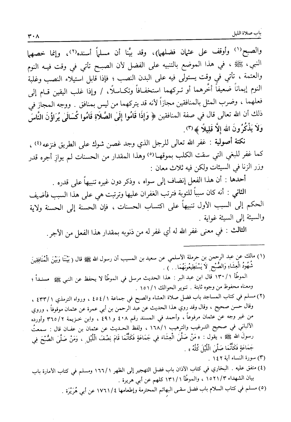 (¬2) مسلم في كتاب المساجد باب فضل صلاة العشاء والصبح في جماعة 4/ 451، ورواه الترمذي 1/ 433، وقال حسن صحيح، وقال وقد روي هذا الحديث عن عبد الرحمن بن أبي عمرة عن عثمان موقوفًا، وروي من غير وجه عن عثمان مرفوعًا، وأحمد في المسند رقم 408 و 491، وابن خزيمة 2/ 365 وأورده الألباني في صحيح الترغيب والترهيب 1/ 168، ولفظ الحديث عن عثمان بن عفان قال: سمعتُ رسولَ الله - صلى الله عليه وسلم -، يقول: "مَنْ صَلَّى الْعِشَاءَ في جَمَاعةٍ فَكَأنَّمَا قَامَ نِصْفَ الْلَّيْلِ، وَمَنْ صَلَّى الصُّبحَ في جَمَاعَةٍ فَكَأنَّمَا صَلَّى الْلَّيْلَ كُلَّه".