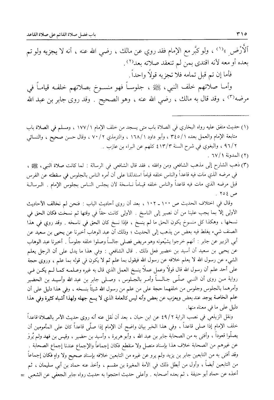 (¬3) ذهب الشارح إلى مذهب الشافعي ومن وافقه، فقد قال الشافعي في الرسالة: لما كانت صلاة النبي، - صلى الله عليه وسلم -، قبل مرضه الذي مات فيه قاعدًا والناس خلفه قيامًا استدللنا على أن أمره الناس بالجلوس في سقطته عن الفرس قبل مرضه الذي مات فيه قاعدًا والناس خلفه قيامًا ناسخة لأن يجلس الناس بجلوس الإمام. الرسالة ص 254.