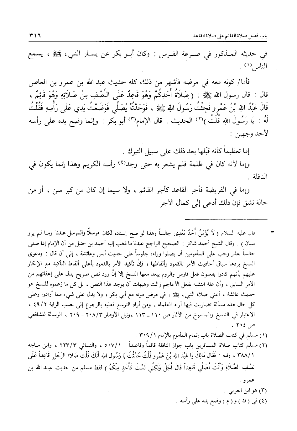 = قال عليه السلام (لا يؤَمِّنُ أحَدٌ بَعْدي جالسًا وهذا لو صح إسناده لكان مرسلًا والمرسل عندنا وما لم يرو سيان). وقال الشيخ أحمد شاكر: الصحيح الراجح عندنا ما ذهب إليه أحمد بن حنبل من أن الإمام إذا صلى جالسًا لعذر وجب على المأمومين أن يصلوا وراءه جلوسًا على حديث أنس وعائشة، إلى أن قال: ودعوى النسخ يردها سياق أحاديث الأمر بالقعود وألفاظها؛ فإنَّ تأكيد الأمر بالقعود بأعلى ألفاظ التأكيد مع الإنكار عليهم بأنهم كادوا يفعلون فعل فارس والروم يبعد معها النسخ إلا إنْ ورد نص صريح يدل على إعفائهم من الأمر السابق، وأن علة التشبه بفعل الأعاجم زالت وهيهات أن يوجد هذا النص، بل كل ما زعموه للنسخ هو حديث عائشة، أعني صلاة النبي، - صلى الله عليه وسلم -، في مرض موته مع أبي بكر، ولا يدل على شيء مما أرادوا وعلى كل حال هذه مسألة تضاربت فيها آراء العلماء، ومن أراد التوسع فعليه بالرجوع إلى نصب الراية 2/ 49، الاعتبار في الناسخ والمنسوخ من الآثار ص 110 - 113، ونيل الأوطار 3/ 208 - 209، الرسالة للشافعي ص 254.