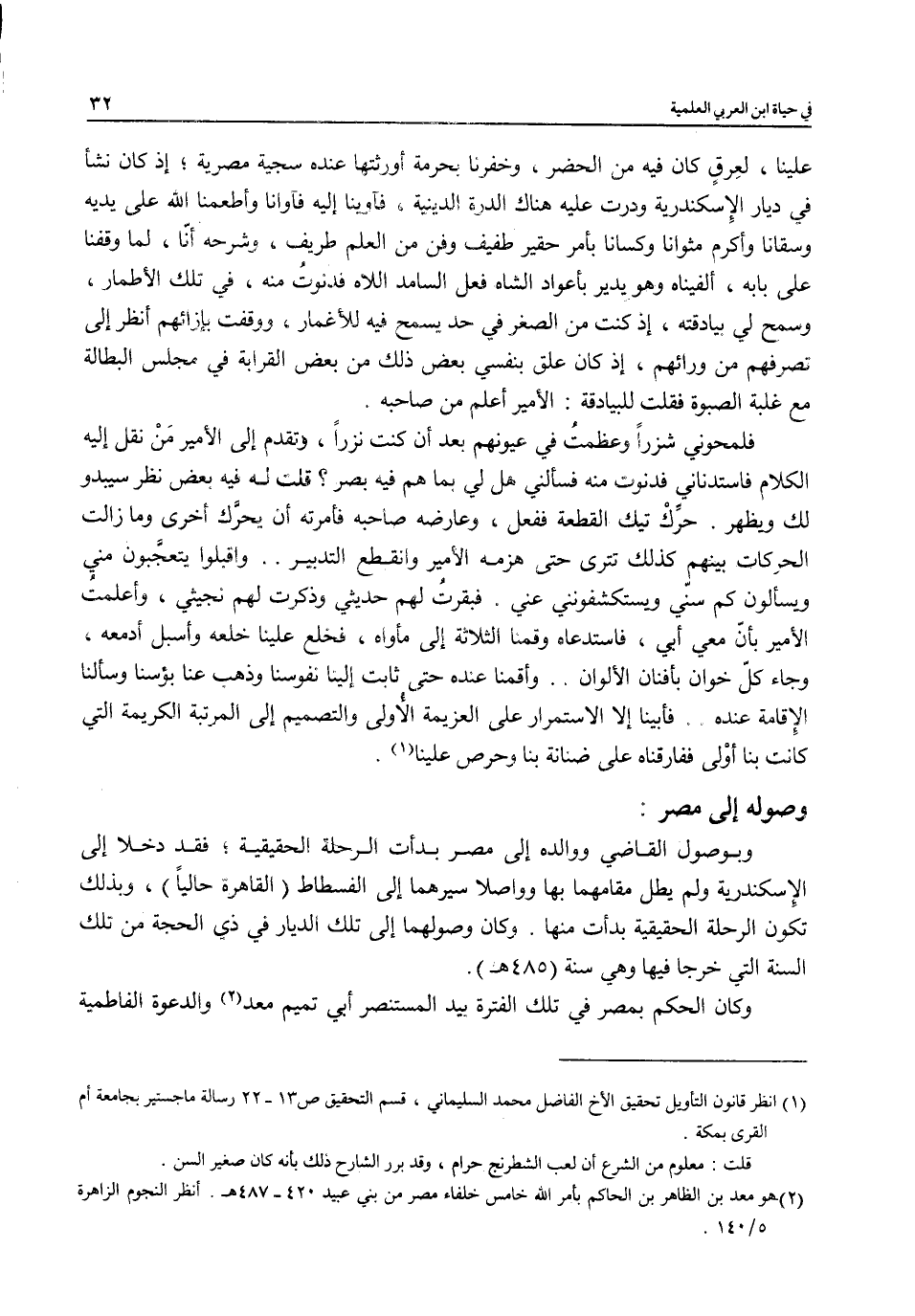 فلمحوني شزرًا عظمتُ في عيونهم بعد أن كنت نزراً، وتقدم إلى الأمير مَنْ نقل إليه الكلام فاستدناني فدنوت منه فسألني هل لي بما هم فيه بصر؟ قلت له فيه بعض نظر سيبدو لك ويظهر. حرِّكْ تيك القطعة ففعل، وعارضه صاحبه فأمرته أن يحرَّك أخرى وما زالت الحركات بينهم كذلك تترى حتى هزمه الأمير وانقطع التدبير .. واقبلوا يتعجَّبون مني ويسألون كم سنّي ويستكشفونني عني. فبقرتُ لهم حديثي وذكرت لهم نجيثي، وأعلمتُ الأمير بأنّ معي أبي، فاستدعاه وقمنا الثلاثة إلى مأواه، فخلع علينا خلعه وأسبل أدمعه، وجاء كلّ خوان بأفنان الألوان .. وأقمنا عنده حتى ثابت إلينا نفوسنا وذهب عنا بؤسنا وسألنا الإِقامة عنده .. فأبينا إلا الاستمرار على العزيمة الأُولى والتصميم إلى المرتبة الكريمة التي كانت بنا أوْلى ففارقناه على ضنانة بنا وحرص علينا (¬1).