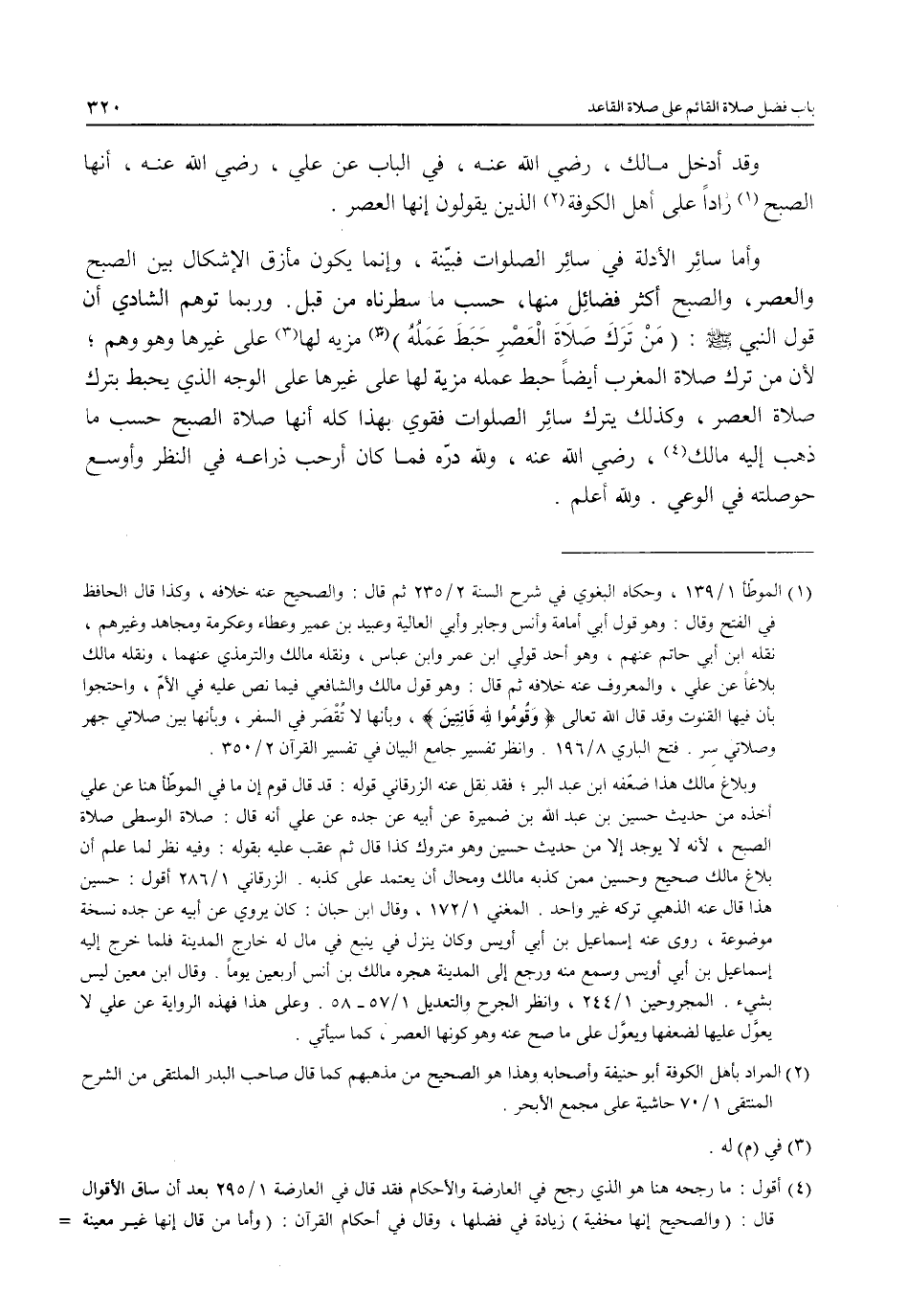 وبلاغ مالك هذا ضعّفه ابن عبد البر؛ فقد نقل عنه الزرقاني قوله: قد قال قوم إن ما في الموطّأ هنا عن علي أخذه من حديث حسن بن عبد الله بن ضميرة عن أبيه عن جده عن علي أنه قال: صلاة الوسطى صلاة الصبح، لأنه لا يوجد إلا من حديث حسين وهو متروك كذا قال ثم عقب عليه بقوله: وفيه نظر لما علم أن بلاغ مالك صحيح وحسين ممن كذبه مالك ومحال أبي يعتمد على كذبه. الزرقاني 1/ 286 أقول: حسين هذا قال عنه الذهبي تركه عير واحد. المغني 1/ 172، وقال ابن حبان: كان يروي عن أبيه عن جده نسخة موضوعة، روى عنه إسماعيل بن أبي أويس وكان ينزل في ينبع في مال له خارج المدينة فلما خرج إليه إسماعيل بن أبي أويس وسمع منه ورجع إلى المدينة هجره مالك بن أنس أربعين يومًا. وقال ابن معين ليس بشيء. المجروحين 1/ 244، وانظر الجرح والتعديل 1/ 57 - 58. وعلى هذا فهذه الرواية عن علي لا يعوَّل عليها لضعفها ويعوَّل على ما صح عنه وهو كونها العصر، كما سيأتي.