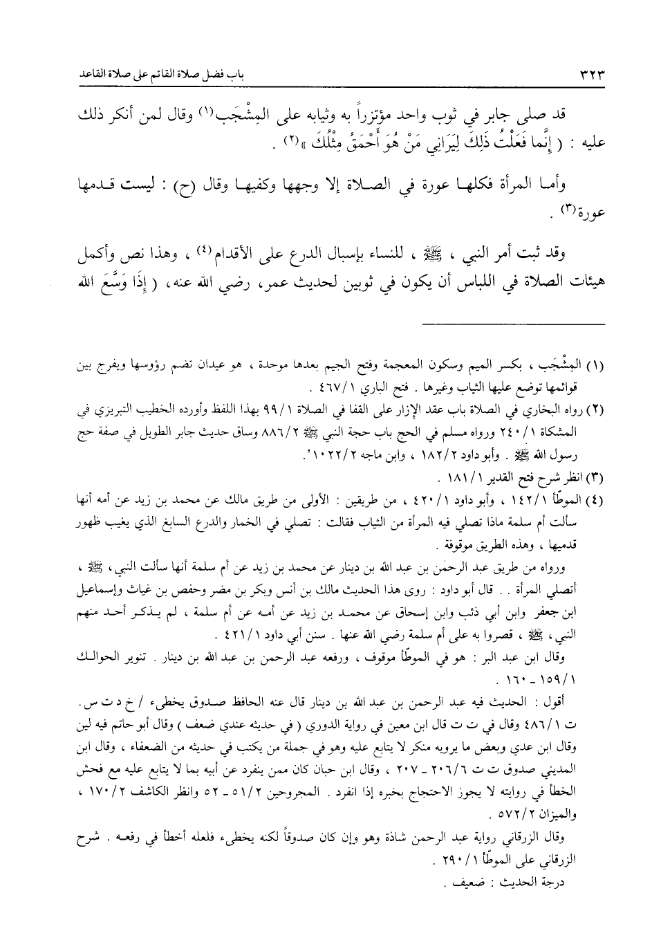 وقد ثبت أمر النبي، - صلى الله عليه وسلم -، للنساء بإسبال الدرع على الأقدام (¬4)، وهذا نص وأكمل هيئات الصلاة في اللباس أن يكون في ثوبين لحديت عمر، رضي الله عنه، (إِذا وَسَّعَ الله