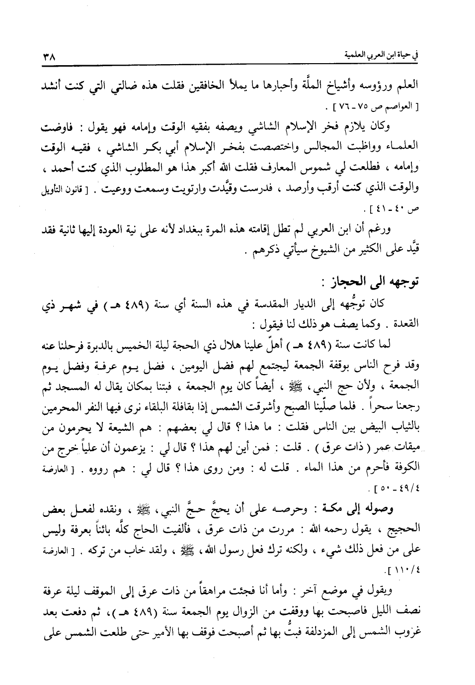ويقول في موضع آخر: وأما أنا فجئت مراهقاً من ذات عرق إلى الموقف ليلة عرفة نصف الليل فأصبحت بها ووقفت من الزوال يوم الجمعة سنة (489 هـ)، ثم دفعت بعد غروب الشمس إلى المزدلفة فبتُّ بها ثم أصبحت فوقف بها الأمير حتى طلعت الشمس على