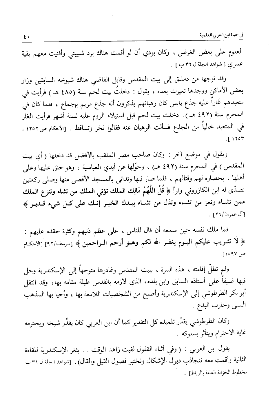 العلوم على بعض الغرض، وكان بودي أن لو أقمت هناك برد شبيبتي وأفنيت معهم بقية عمري [شواهد الحيلة ل 32 ب].