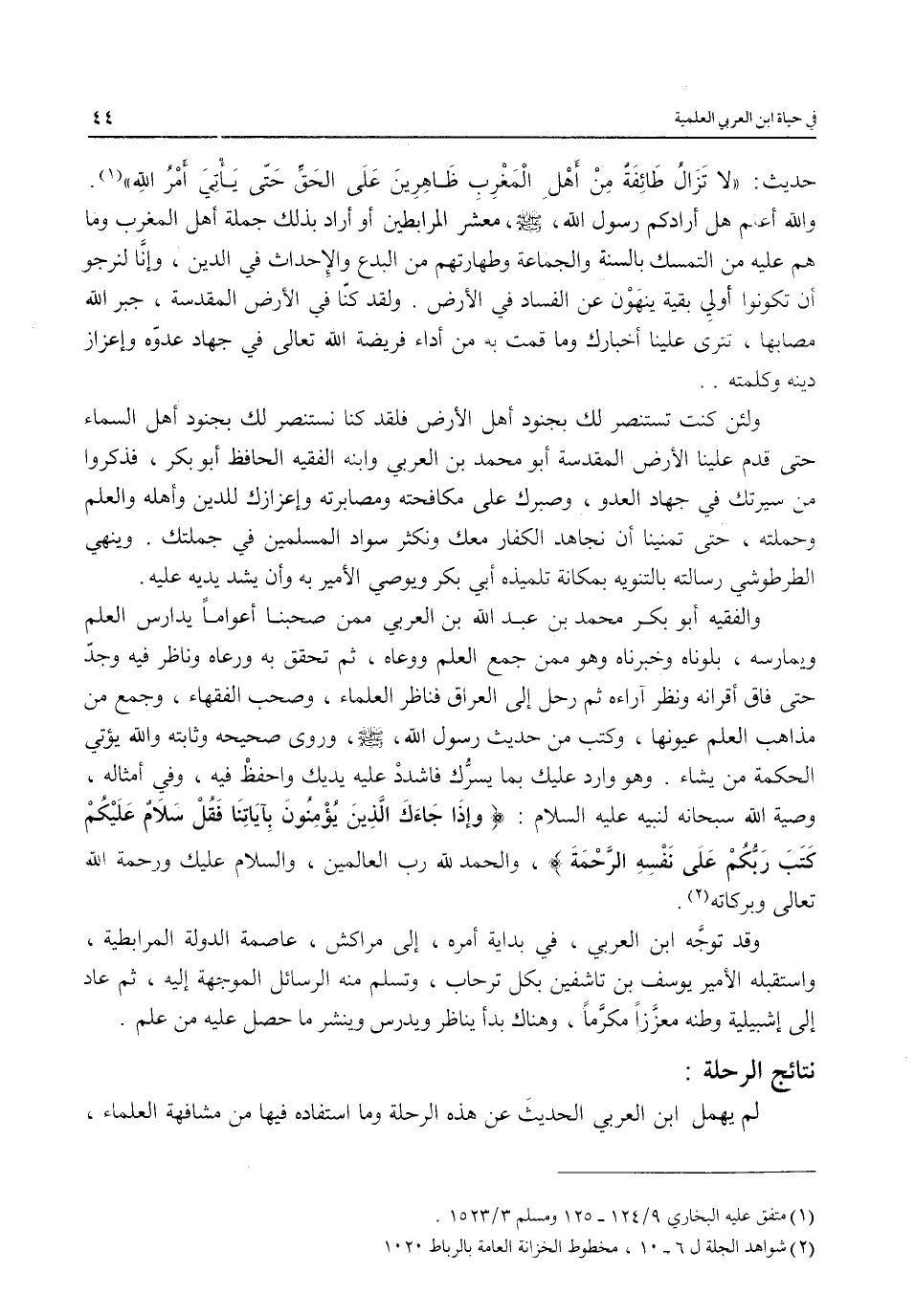 والفقيه أبو بكر محمَّد بن عبد الله بن العربي ممن صحبنا أعواماً يدارس العلم ويمارسه، بلوناه وخبرناه وهو ممن جمع العلم ووعاه، ثم تحقق به ورعاه وناظر فيه وجدّ حتى فاق أقرانه ونظر آراءه ثم رحل إلى العراق فناظر العلماء، وصحب الفقهاء، وجمع من مذاهب العلم عيونها، وكتب من حديث رسول الله، - صلى الله عليه وسلم -، وروى صحيحه وثابته والله يؤتي الحكمة من يشاء. وهو وارد عليك بما يسرُّك فاشددْ عليه يديك واحفظْ فيه، وفي أمثاله، وصية الله سبحانه لنبيه عليه السلام: {وإذَا جَاءَكَ الَّذِينَ يُؤْمِنُونَ بِآيَاتِنَا فَقُلْ سَلاَمٌ عَلَيْكُمْ كَتَبَ رَبُّكُمْ عَلى نَفْسِهِ الرحْمَةَ}، والحمد لله رب العالمين، والسلام عليك ورحمة الله تعالى وبركاته (¬2).