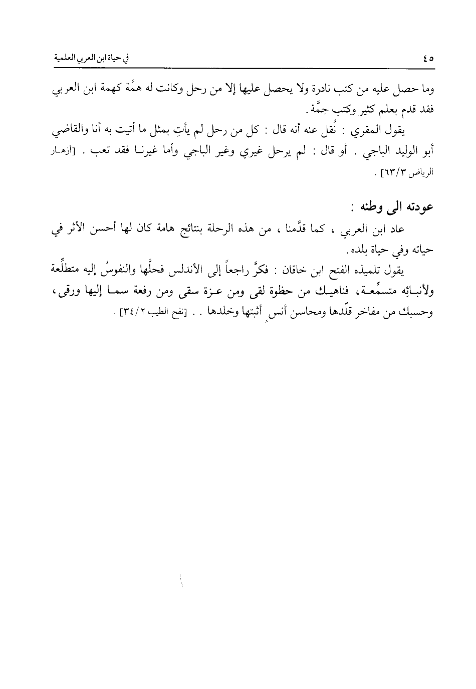 وما حصل عليه من كتب نادرة ولا يحصل عليها إلا من رحل وكانت له همَّة كهمة ابن العربي فقد قدم بعلم كثير وكتبه جمَّة.