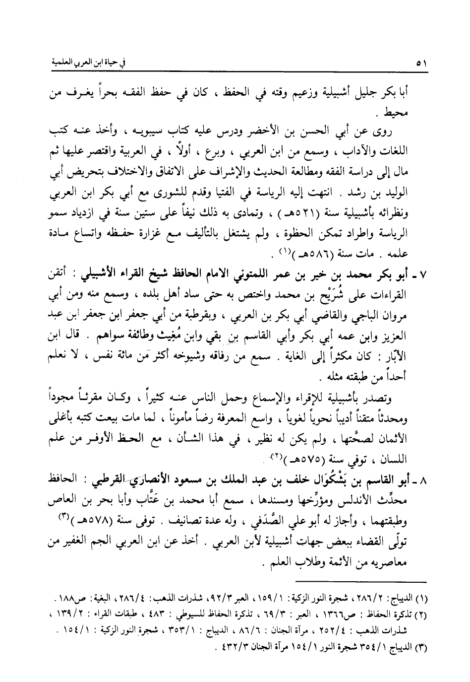 8 - أبو القاسم بن بَشْكُوَال خلف بن عبد الملك بن مسعود الأنصاري القرطبي: الحافظ محدِّث الأندلس ومؤرِّخها ومسندها، سمع أبا محمَّد بن عَتَّاب وأبا بحر بن العاص وطبقتهما، وأجاز له أبو علي الصَّدَفي، وله عدة تصانيف. توفي سنة (578 هـ) (¬3) تولّى القضاء ببعض جهات أشبيلية لأبن العربي. أخذ عن ابن العربي الجم الغفير من معاصريه من الأئمة وطلاب العلم.