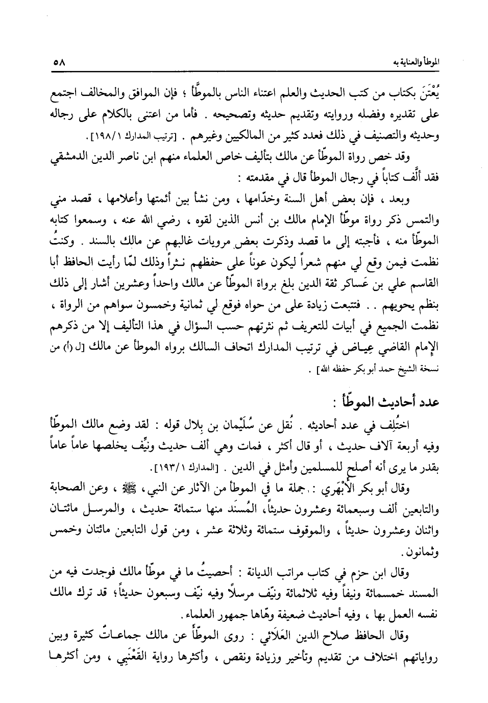 وبعد، فإن بعض أهل السنة وخدّامها، ومن نشأ بين أئمتها وأعلامها، قصد مني والتمس ذكر رواة موطّأ الإِمام مالك بن أنس الذين لقوه، رضي الله عنه، وسمعوا كتابه الموطّأ منه، فأجبته إلى ما قصد وذكرت بعض. مرويات غالبهم عن مالك بالسند. وكنتُ نظمت فيمن وقع لي منهم شعراً ليكون عوناً على حفظهم نثراً وذلك لمّا رأيت الحافظ أبا القاسم علي بن عَساكر ثقة الدين بلغ برواة الموطّأ عن مالك واحداً وعشرين أشار إلى ذلك بنظم يحويهم .. فتتبعت زيادة على من حواه فوقع لي ثمانية وخمسون سواهم من الرواة، نظمت الجميع في أبيات للتعريف ثم نثرتهم حسب السؤال في هذا التأليف إلا من ذكرهم الإِمام القاضي عِياض في ترتيب المدارك إتحاف السالك برواه الموطّأ عن مالك [ل (1) من نسخة الشيخ حمد أبو بكر حفظه الله].