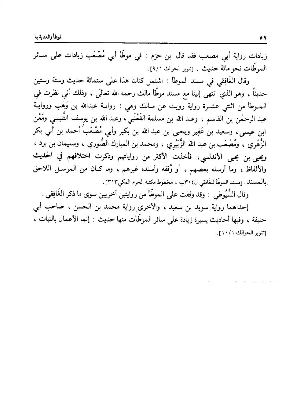 وقال السُّيُوطي: وقد وقفت على الموطّأ من روايتين أخريين سوى ما ذكر الغَافِقي. إحداهما رواية سويد بن سعيد، والأخرى رواية محمَّد بن الحسن، صاحب أبي حنيفة، وفيها أحاديث يسيرة زيادة على سائر الموطّآت منها حديث: إنما الأعمال بالنيات، [تنوير الحوالك 1/ 10].