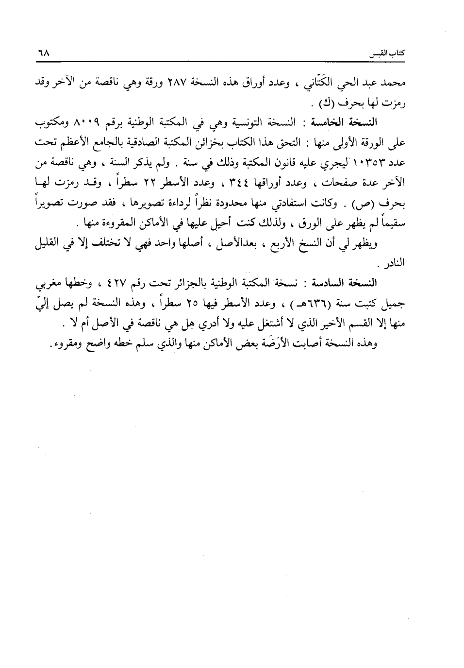 محمَّد عبد الحي الكَتّاني، وعدد أوراق هذه النسخة 287 ورقة وهي ناقصة من الآخر وقد رمزت لها بحرف (ك).