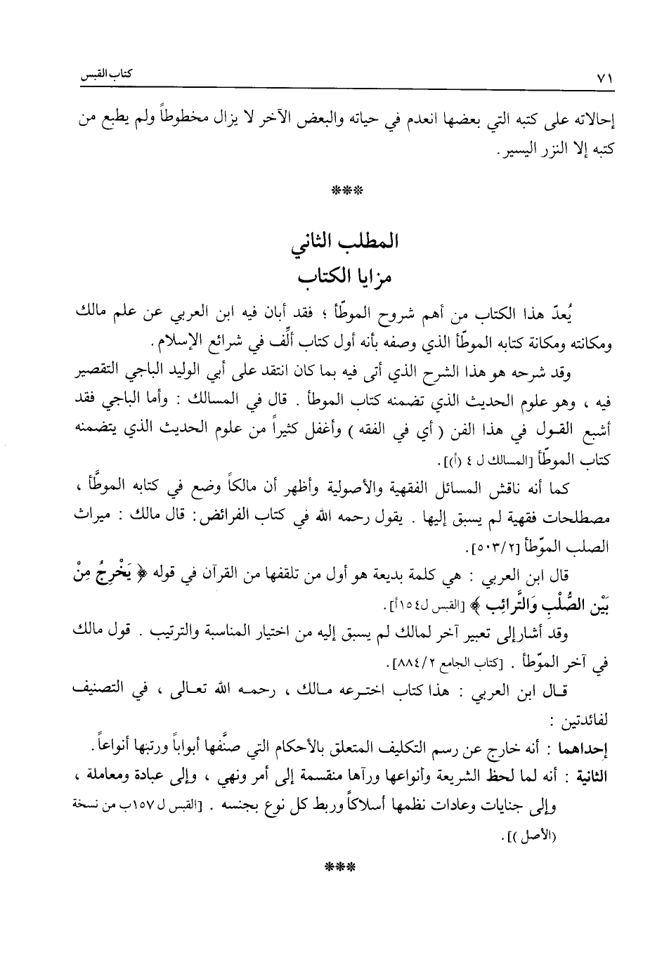الثانية: أنه لما لحظ الشريعة وأنواعها ورآها منقسمة إلى أمر ونهي، وإلى عبادة ومعامله، وإلى جنايات وعادات نظمها أسلاكاً وربط كل نوع بجنسه. [القبس ل 157 ب من نسخة (الأصل)].