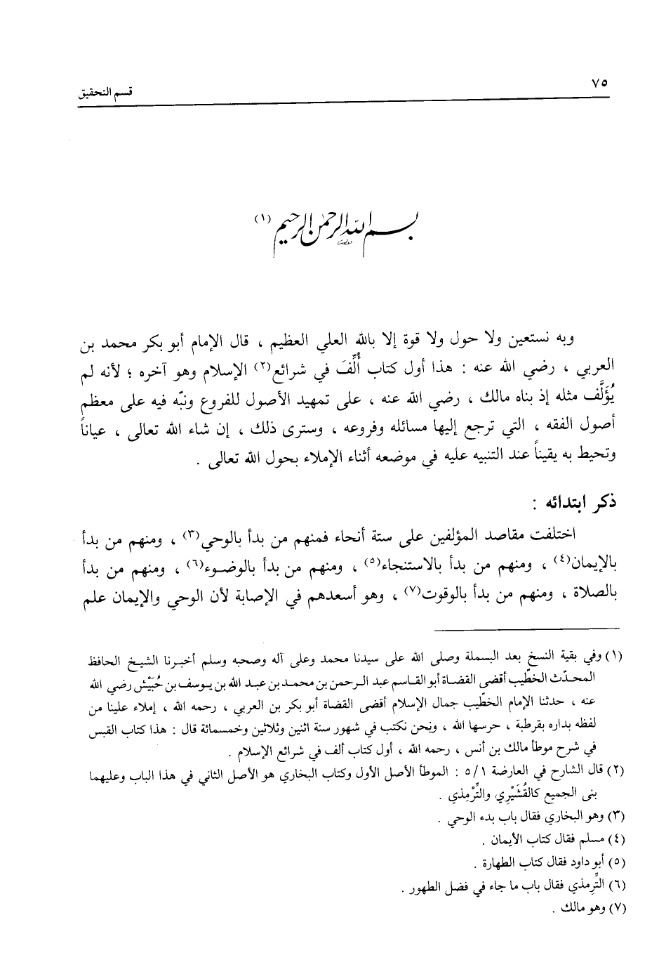 وبه نستعين ولا حول ولا قوة إلا بالله العلي العظيم، قال الإِمام أبو بكر محمَّد بن العربي، رضي الله عنه: هذا أول كتاب أُلِّفَ في شرائع (¬2) الإِسلام وهو آخره؛ لأنه لم يُؤَلَّف مثله إذ بناه مالك، رضي الله عنه، على تمهيد الأصول للفروع ونبّه فيه على معظم أصول الفقه، التي ترجع إليها مسائله وفروعه، وسترى ذلك، إن شاء الله تعالى، عيانًا وتحيط به يقيناً عند التنبيه عليه في موضعه أثناء الإملاء بحول الله تعالى.