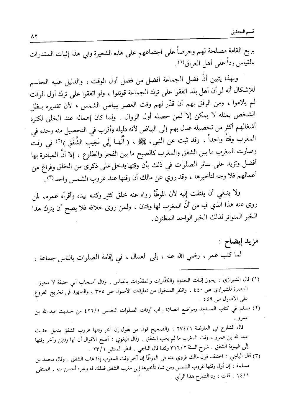 وبهذا يتبين أنَّ فضل الجماعة أفضل من فضل أول الوقت، والدليل عليه الحاسم للإشكال أنه لو أن أهل بلد اتفقوا على ترك الجماعة قوتلوا، ولو اتفقوا على ترك أول الوقت لم يلاموا، ومن الرفق بهم أن قدّر لهم وقت العصر ببياض الشمس؛ لأن تقديره بظل الشخص بمثله لا يمكن إلا لمن حصله أول الزوال. ولما كان إهماله عند الخلق لكثرة أشغالهم أكثر من تحصيله عدل بهم إلى البياض لأنه دليله وأقرب في التحصيل منه وحده في المغرب وقتاً واحداً، وقد ثبت عن النبي، - صلى الله عليه وسلم -، (أنَّها إِلَى مَغِيب الشَّفَقِ) (¬2) في وقت وصارت المغرب ما بين الشفق والمغرب كالصبح ما بين الفجر والطلوع، إلا أنَّ المبادرة بها أفضل وتزيد على سائر الصلوات في ذلك بأن وقتها يدخل على ذكرى من الخلق وفراغ من أعمالهم فلا وجه لتأخيرها، وقد روي عن مالك أن وقتها عند غروب الشمس واحد (¬3).