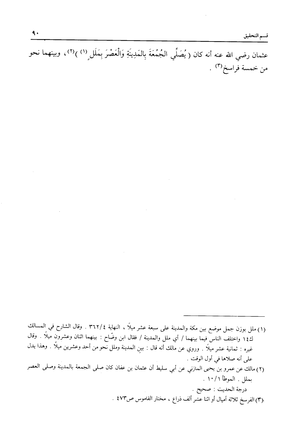عثمان رضي الله عنه أنه كان (يُصَلِّي الجُمُعَةَ بِالمَدِينَةِ وَالْعَصْرَ بِمَلَلٍ (¬1)) (¬2)، وبينهما نحو من خمسة فراسخ (¬3).