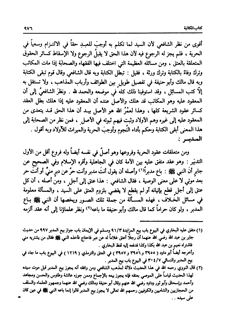 أقوى من نظر الشافعي لأن السيد لما تكلم به أوجبَ للعبدِ حقاً في الالتزام وسعياً في الحرية، فلم يجز له الرجوع فيه لأن هذا الحق لا يقبلُ الرجوع ولا الإسقاط كسائر الحقوق المتعلقة بالعتق، ومن مسائله العظيمة التي اختلف فيها الفقهاء والصحابة إذا مات المكاتب وترك وفاءً بالكتابة وترك ورثة، فقيل: تبطل الكتابة وبه قال الشافعي وقال قوم تبقى الكتابة وبه قال مالك وأبو حنيفة في تفصيل طويل بين الطوائف وأرباب المذاهب، ولا تستقل به إلَّا كتب المسائِل، وقد استوفينا ذلك كله في موضعه والحمد لله. ونظرَ الشافعي إلى أن المعقود عليه وهو المكاتب قد هلك والأصل عنده أن المعقود عليه إذا هلك بطل العقد كسائر عقود الشريعة كلها، وهذا لعمْرُ الله هو الأصل بيد أن هذا الحق قد يتعدى من المعقود عليه إلى غيره وهم الأولاد وثبت فيهم ثبوته في الأصلِ، فمن نظر من الصحابة إلى هذا المعنى أبقى الكتابة وحكم بأداء النُجوم وأوجبَ الحرية والميراث للأولاد وبه أقول.