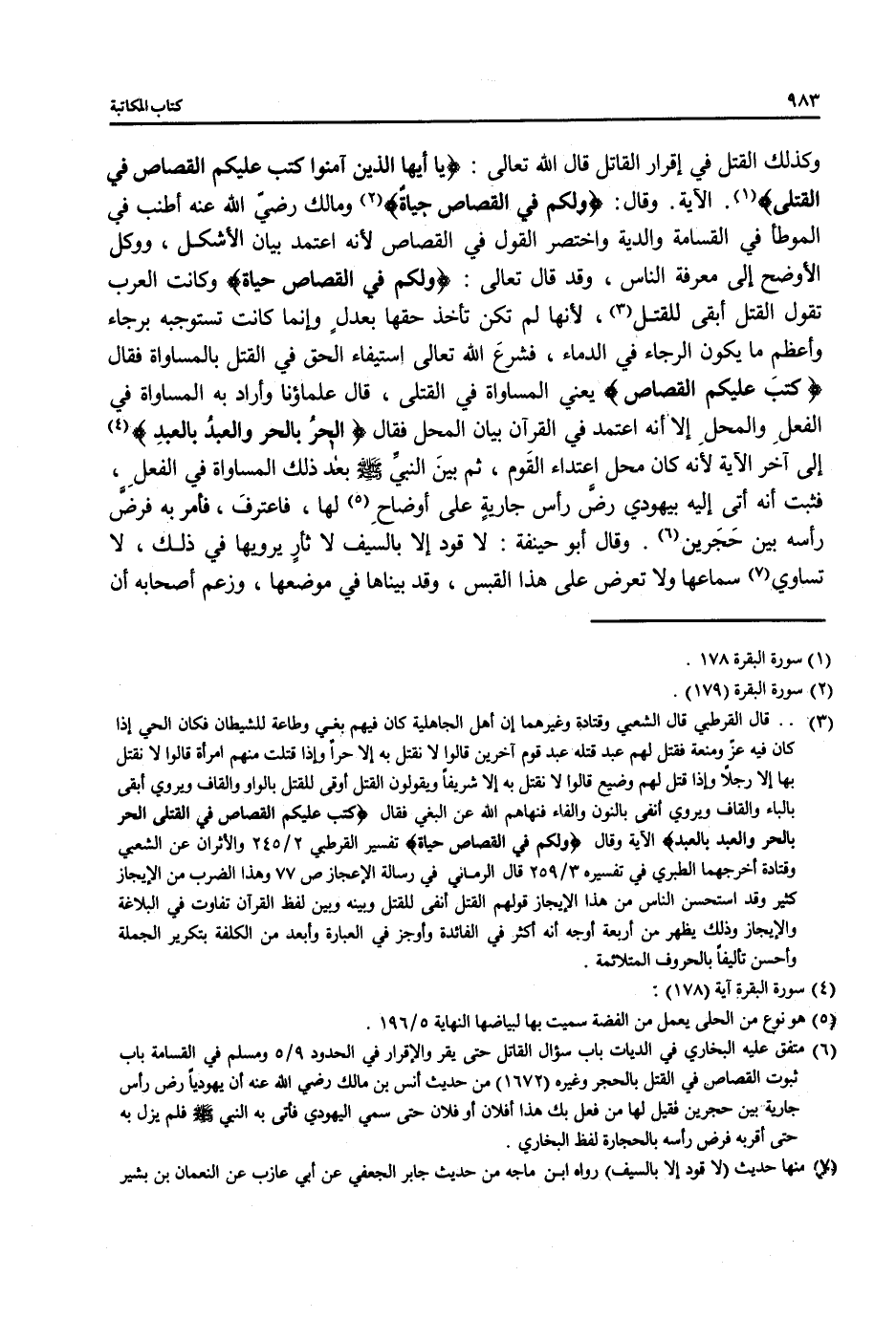 (¬3) .. قال القرطبي قال الشعبي وقتادة وغيرهما إن أهل الجاهلية كان فيهم بغي وطاعة للشيطان فكان الحي إذا كان فيه عزّ ومنعة فقتل لهم عبد قتله عبد قوم آخرين قالوا لا نقتل به إلا حرًّا وإذا قتلت منهم امرأة قالوا لا نقتل بها إلا رجلاً وإذا قتل لهم وضيع قالوا لا نقتل به إلا شريفًا ويقولون القتل أوقى للقتل بالواو والقاف ويروي أبقي بالباء والقاف ويروي أنفى بالنون والفاء فنهاهم الله عن البغي فقال {كتب عليكم القصاص في القتلى الحر بالحر والعبد بالعبد} الآية وقال {ولكم في القصاص حياة} تفسير القرطبي 2/ 245 والأثران عن الشعبي وقتادة أخرجهما الطبري في تفسيره 3/ 259 قال الرماني في رسالة الإعجاز ص 77 وهذا الضرب من الإيجاز كثير وقد استحسن الناس من هذا الإيجاز قولهم القتل أنفى للقتل وبينه وبين لفظ القرآن تفاوت في البلاغة والإيجاز وذلك يظهر من أربعة أوجه أنه أكثر في الفائدة وأوجز في العبارة وأبعد من الكلفة بتكرير الجملة وأحسن تأليفًا بالحروف المتلائمة.