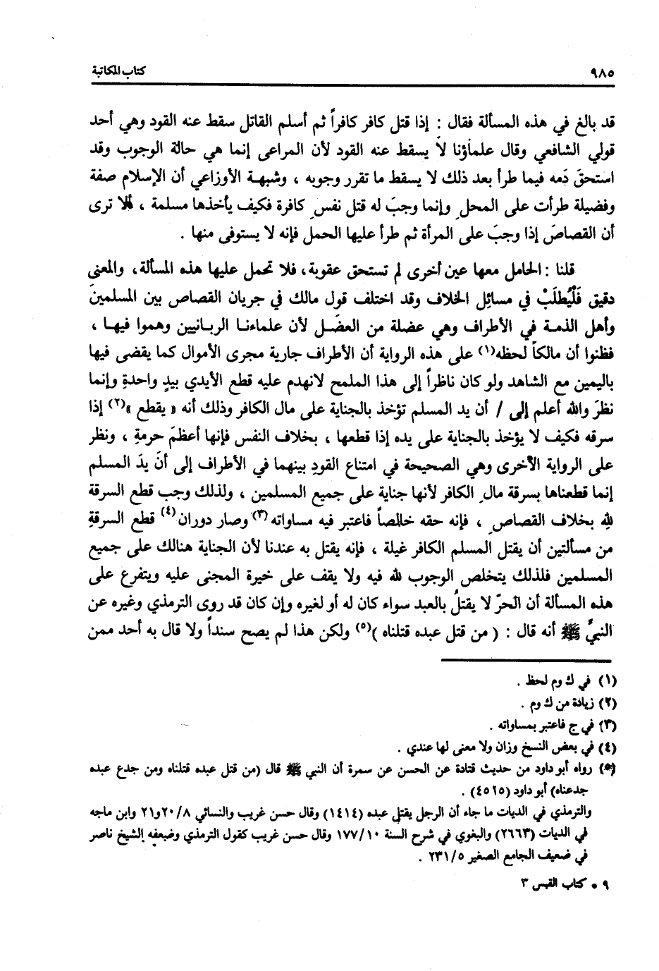 قلنا: الحامل معها عين أخرى لم تستحق عقوبة، فلا تحمل عليها هذه المسألة، والمعنى دقيق فَلْيُطلَبْ في مسائل الخلاف وقد اختلف قول مالك في جريان القصاص بين المسلمينَ وأهل الذمة في الأطراف وهي عضلة من العضَل لأن علماءنا الربانيين وهموا فيها، فظنوا أن مالكًا لحظه (¬1) على هذه الرواية أن الأطراف جارية مجرى الأموال كما يقضى فيها باليمين مع الشاهد ولو كان ناظراً إلى هذا الملمح لانهدم عليه قطع الأيدي بيدٍ واحدة وإنما نظرَ والله أعلم إلى أن يد المسلم تؤخذ بالجناية على مال الكافر وذلك أنه "يقطع" (¬2) إذا سرقه فكيف لا يؤخذ بالجناية على يده إذا قطعها، بخلاف النفس فإنها أعظم حرمة، ونظر على الرواية الأخرى وهي الصحيحة في امتناع القودِ بينهما في الأطراف إلى أنَ يدَ المسلم إنما قطعناها بسرقة مالِ الكافر لأنها جناية على جميع المسلمين، ولذلك وجب قطع السرقة لله بخلاف القصاصِ، فإنه حقه خالصاً فاعتبر فيه مساواته (¬3) وصار دوران (¬4) قطع السرقةِ من مسألتين أن يقتل المسلم الكافر غيلة، فإنه يقتل به عندنا لأن الجناية هنالك على جميع المسلمين فلذلك يتخلص الوجوب لله فيه ولا يقف على خيرة المجني عليه ويتفرع على هذه المسألة أن الحرّ لا يقتلُ بالعبد سواء كان له أو لغيره وإن كان قد روى الترمذي وغيره عن النبي - صلى الله عليه وسلم - أنه قال: (من قتل عبده قتلناه) (¬5) ولكن هذا لم يصح سندًا ولا قال به أحد ممن