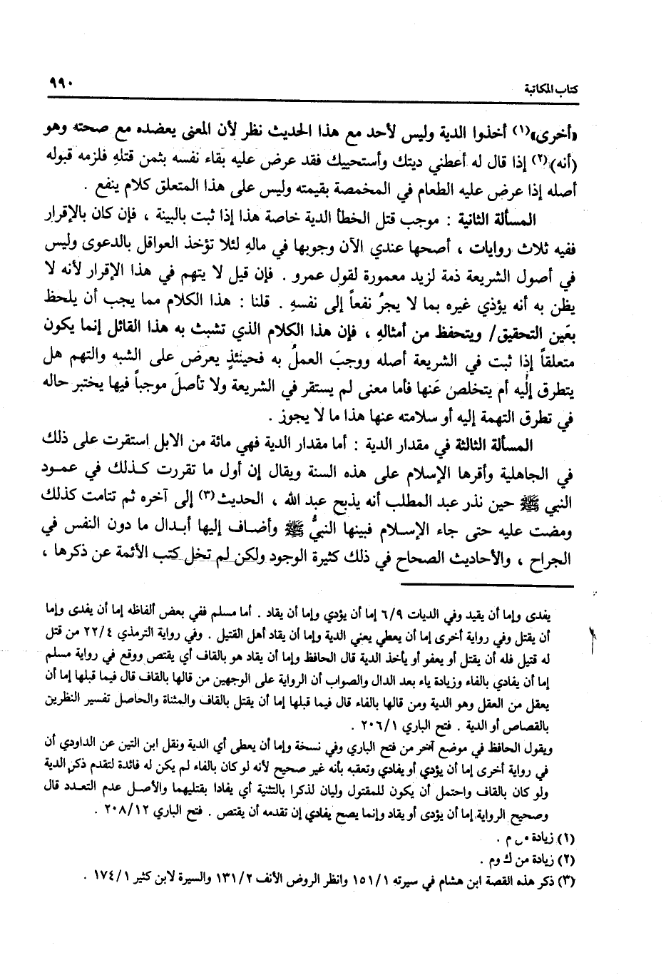 ويقول الحافظ في موضع آخر من فتح الباري وفي نسخة وإما أن يعطى أي الدية ونقل ابن التين عن الداودي أن في رواية أخرى إما أن يؤدي أو يفادي وتعقبه بأنه غير صحيح لأنه لو كان بالفاء لم يكن له فائدة لتقدم ذكر الدية ولو كان بالقاف واحتمل أن يكون للمقتول ولبيان لذكرا بالتثنية أي يفادا بقتليهما والأصل عدم التعدد قال وصحيح الرواي إما أن يؤدى أو يقاد إنما يصح يفادي إن تقدمه أن يقتص. فتح الباري 12/ 208.