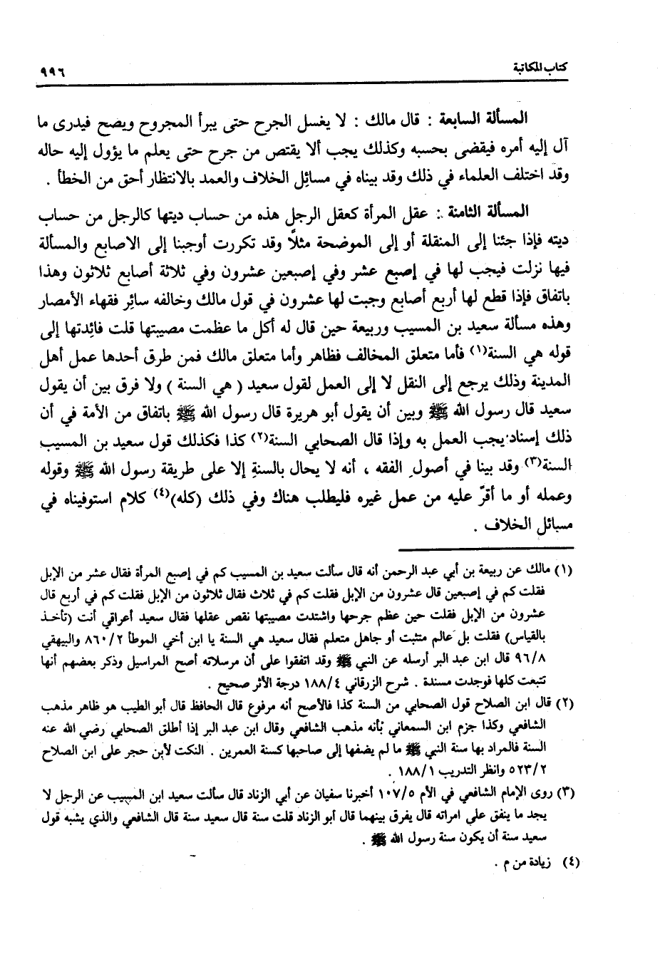 المسألة الثامنة: عقل المرأة كعقل الرجل هذه من حساب ديتها كالرجل من حساب ديته فإذا جئنا إلى المنقلة أو إلى الموضحة مثلًا وقد تكررت أوجبنا إلى الأصابع والمسألة فيها نزلت فيجب لها في أصبع عشر وفي إصبعين عشرون وفي ثلاثة أصابع ثلاثون وهذا باتفاق فإذا قطع لها أربع أصابع وجبت لها عشرون في قول مالك وخالفه سائِر فقهاء الأمصار وهذه مسألة سعيد بن المسيب وربيعة حين قال له أكل ما عظمت مصيبتها قلت فائِدتها إلى قوله هي السنة (¬1) فأما متعلق المخالف فظاهر وأما متعلق مالك فمن طرق أحدها عمل أهل المدينة وذلك يرجع إلى النقل لا إلى العمل لقول سعيد (هي السنة) ولا فرق بين أن يقول سعيد قال رسول الله صلى الله عليه وسلم وبين أن يقول أبو هريرة قال رسول الله صلى الله عليه وسلم باتفاق من الأمة في أن ذلك إسناد يجب العمل به وإذا قال الصحابي السنة (¬2) كذا فكذلك قول سعيد بن المسيب السنة (¬3) وقد بينا في أصولِ الفقه، أنه لا يحال بالسنةِ إلا على طريقة رسول الله صلى الله عليه وسلم وقوله وعمله أو ما أقرّ عليه من عمل غيره فليطلب هناك وفي ذلك (كله) (¬4) كلام استوفيناه في مسائل الخلاف.