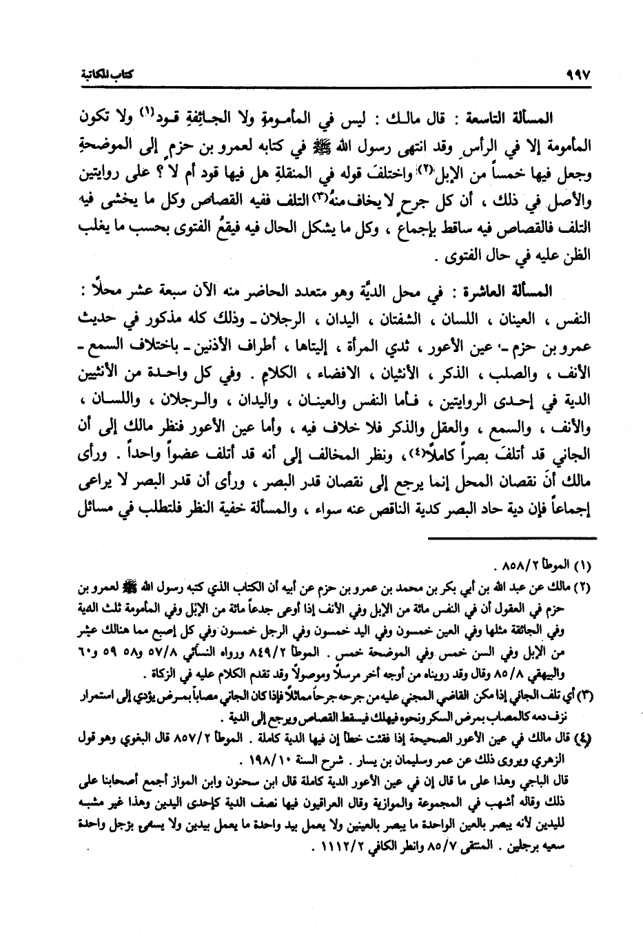 (¬2) مالك عن عبد الله بن أبي بكر بن محمَّد بن عمرو بن حزم عن أبيه أن الكتاب الذي كتبه رسول الله صلى الله عليه وسلم لعمرو بن حزم في العقول أن في النفس مائة من الإبل وفي الأنف إذا أوعى جدعاً مائة من الإبل وفي المأمومة ثلث الدية وفي الجائفة مثلها وفي العين خمسون وفي اليد خمسون وفي الرجل خمسون وفي كل إصبع مما هنالك عشر من الإبل وفي السن خمس وفي الموضحة خمس. الموطأ 2/ 849 ورواه النسائي 8/ 57 و58 و59 و60 والبيهقي 8/ 85 وقال وقد رويناه من أوجه أخر مرسلاً وموصولًا وقد تقدم الكلام عليه في الزكاة.