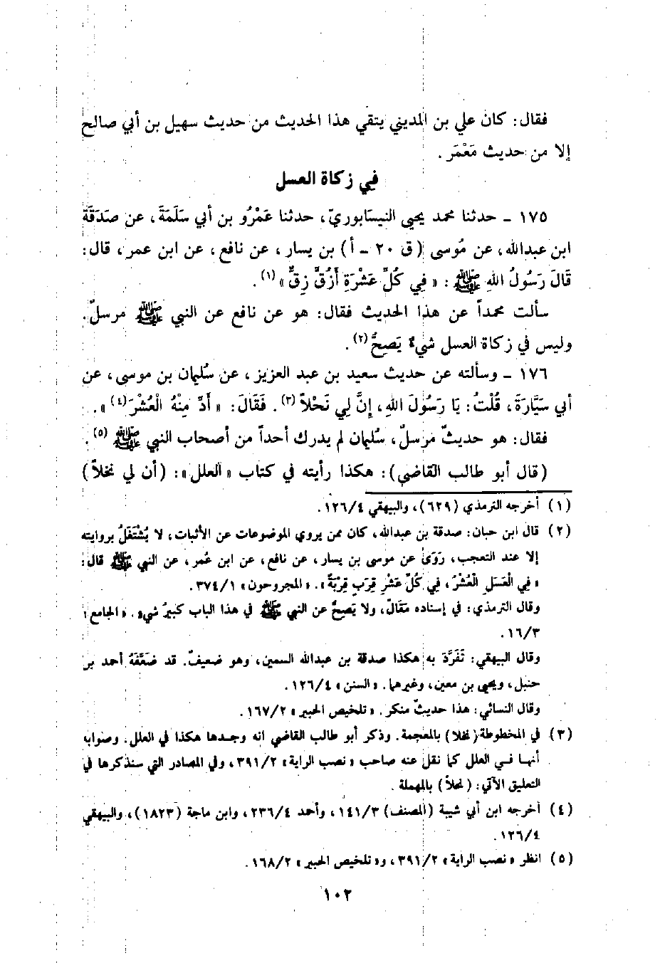 175 - حَدَّثَنَا مُحَمَّدٌ يَحْيَى النَّيْسَابُورِيُّ , حَدَّثَنَا عَمْرُو بْنُ أَبِي سَلَمَةَ , عَنْ صَدَقَةَ بْنِ عَبْدِ اللَّهِ , عَنْ مُوسَى بْنِ يَسَارٍ , عَنْ نَافِعٍ , عَنِ ابْنِ عُمَرَ , قَالَ: قَالَ رَسُولُ اللَّهِ صَلَّى اللهُ عَلَيْهِ وَسَلَّمَ: «§فِي كُلِّ عَشَرَةِ أَزُقٍّ زِقٌّ» سَأَلْتُ مُحَمَّدًا عَنْ هَذَا الْحَدِيثِ فَقَالَ: هُوَ عَنْ نَافِعٍ , عَنِ النَّبِيِّ صَلَّى اللهُ عَلَيْهِ وَسَلَّمَ مُرْسَلٌ. وَلَيْسَ فِي زَكَاةِ الْعَسَلِ شَيْءٌ يَصِحُّ ,
