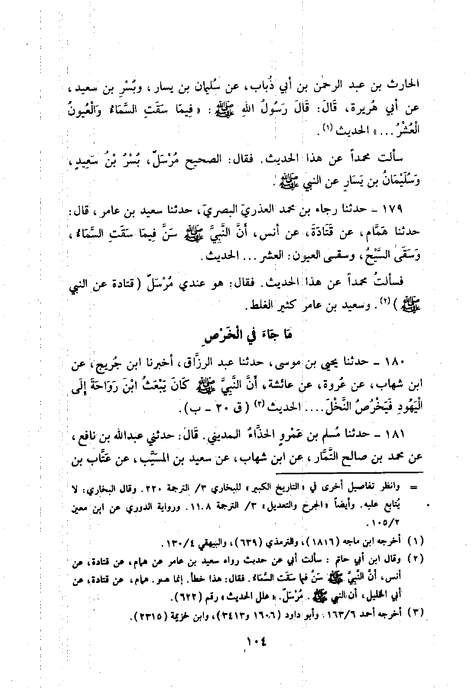 179 - حَدَّثَنَا رَجَاءُ بْنُ مُحَمَّدٍ الْعُذْرِيُّ الْبَصْرِيُّ , حَدَّثَنَا سَعِيدُ بْنُ عَامِرٍ , قَالَ: حَدَّثَنَا هَمَّامٌ , عَنْ قَتَادَةَ , عَنْ أَنَسٍ , أَنَّ النَّبِيَّ صَلَّى اللهُ عَلَيْهِ وَسَلَّمَ §سَنَّ فِيمَا سَقَتِ السَّمَاءُ وَسَقَى السَّيْحُ , وَسَقَى الْعُيُونُ الْعُشْرُ " الْحَدِيثَ. فَسَأَلْتُ مُحَمَّدًا عَنْ هَذَا الْحَدِيثِ فَقَالَ: هُوَ عِنْدِي مُرْسَلٌ , قَتَادَةُ عَنِ النَّبِيِّ صَلَّى اللهُ عَلَيْهِ وَسَلَّمَ , وَسَعِيدُ بْنُ عَامِرٍ كَثِيرُ الْغَلَطِ