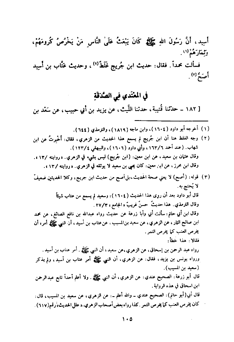 182 - حَدَّثَنَا قُتَيْبَةُ , حَدَّثَنَا اللَّيْثُ , عَنْ يَزِيدَ بْنِ أَبِي حَبِيبٍ , عَنْ سَعْدِ بْنِ سِنَانٍ , عَنْ أَنَسِ بْنِ مَالِكٍ , قَالَ: قَالَ رَسُولُ اللَّهِ صَلَّى اللهُ عَلَيْهِ وَسَلَّمَ: «§الْمُعْتَدِي فِي الصَّدَقَةِ كَمَانِعِهَا» . سَأَلْتُ مُحَمَّدًا عَنْ سَعْدِ بْنِ سِنَانٍ فَقَالَ: الصَّحِيحُ عِنْدِي سِنَانُ بْنُ سَعْدٍ. وَهُوَ صَالِحٌ مُقَارِبُ الْحَدِيثِ وَسَعْدُ بْنُ سِنَانٍ خَطَأٌ إِنَّمَا قَالَهُ اللَّيْثُ