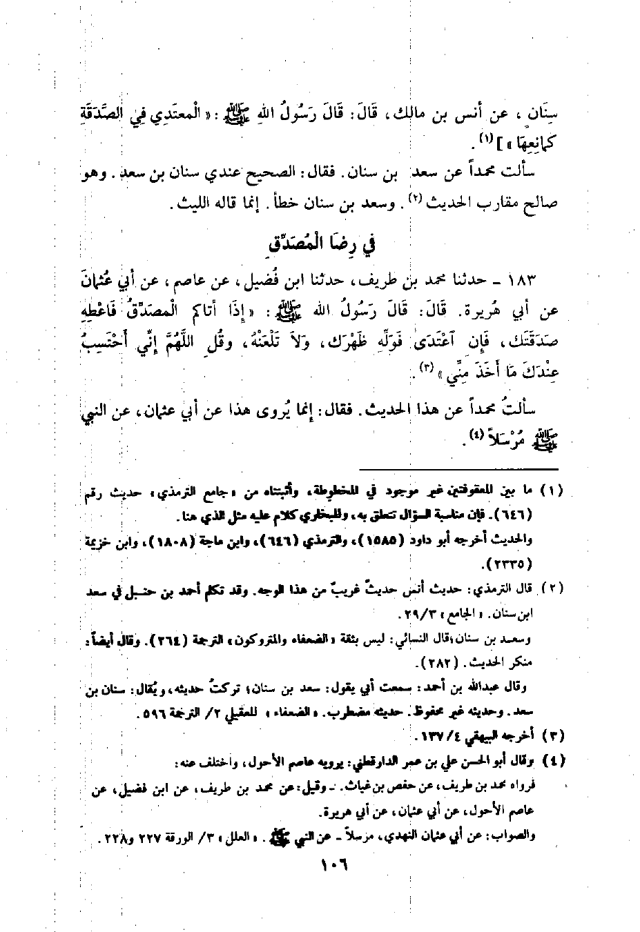 183 - حَدَّثَنَا مُحَمَّدُ بْنُ طَرِيفٍ , حَدَّثَنَا ابْنُ فُضَيْلٍ , عَنْ عَاصِمٍ , عَنْ أَبِي عُثْمَانَ , عَنْ أَبِي هُرَيْرَةَ , قَالَ: قَالَ رَسُولُ اللَّهِ صَلَّى اللهُ عَلَيْهِ وَسَلَّمَ: " §إِذَا أَتَاكُمُ الْمُصَدِّقُ فَأَعْطِهِ صَدَقَتَكَ , فَإِنِ اعْتَدَى فَوَلِّهِ ظَهْرَكَ وَلَا تَلْعَنْهُ , وَقُلِ: اللَّهُمَّ إِنِّي أَحْتَسِبُ عِنْدَكَ مَا أَخَذَ مِنِّي ". سَأَلْتُ مُحَمَّدًا عَنْ هَذَا الْحَدِيثِ فَقَالَ: إِنَّمَا يُرْوَى هَذَا عَنْ أَبِي عُثْمَانَ , عَنِ النَّبِيِّ صَلَّى اللهُ عَلَيْهِ وَسَلَّمَ مُرْسَلًا
