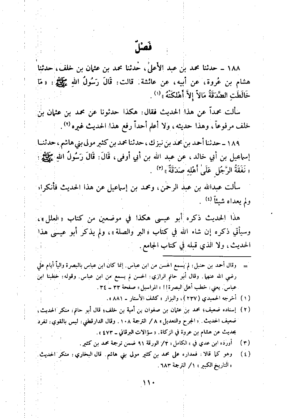 188 - حَدَّثَنَا مُحَمَّدُ بْنُ عَبْدِ الْأَعْلَى , حَدَّثَنَا مُحَمَّدُ بْنُ عُثْمَانَ بْنِ خَلَفٍ , حَدَّثَنَا هِشَامُ بْنُ عُرْوَةَ , عَنْ أَبِيهِ , عَنْ عَائِشَةَ , قَالَتْ: قَالَ رَسُولُ اللَّهِ صَلَّى اللهُ عَلَيْهِ وَسَلَّمَ: «§مَا خَالَطَتِ الصَّدَقَةُ مَالًا إِلَّا أَهْلَكَتْهُ» . سَأَلْتُ مُحَمَّدًا عَنْ هَذَا الْحَدِيثِ فَقَالَ: هَكَذَا حَدَّثُونَا عَنْ مُحَمَّدِ بْنِ عُثْمَانَ بْنِ خَلَفٍ مَرْفُوعًا. وَهَذَا حَدِيثُهُ , وَلَا أَعْلَمُ أَحَدًا رَفَعَ هَذَا الْحَدِيثَ غَيْرُهُ