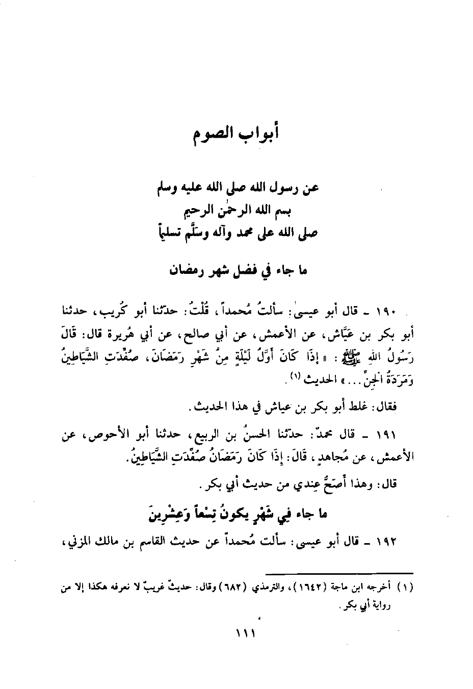 190 - قَالَ أَبُو عِيسَى: سَأَلْتُ مُحَمَّدًا قُلْتُ: حَدَّثَنَا أَبُو كُرَيْبٍ , حَدَّثَنَا أَبُو بَكْرِ بْنُ عَيَّاشٍ , عَنِ الْأَعْمَشِ , عَنْ أَبِي صَالِحٍ , عَنْ أَبِي هُرَيْرَةَ , قَالَ: قَالَ رَسُولُ اللَّهِ صَلَّى اللهُ عَلَيْهِ وَسَلَّمَ: «§إِذَا كَانَ أَوَّلُ لَيْلَةٍ مِنْ شَهْرِ رَمَضَانَ صُفِّدَتِ الشَّيَاطِينُ وَمَرَدَةُ الْجِنِّ» . الْحَدِيثُ. فَقَالَ: غَلَطَ أَبُو بَكْرِ بْنُ عَيَّاشٍ فِي هَذَا الْحَدِيثِ.