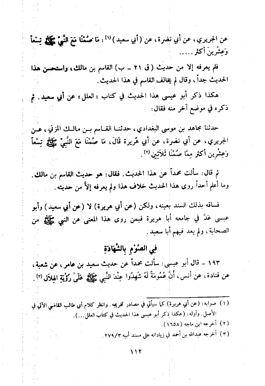 193 - قَالَ أَبُو عِيسَى: سَأَلْتُ مُحَمَّدًا عَنْ حَدِيثِ سَعِيدِ بْنِ عَامِرٍ , عَنْ شُعْبَةَ , عَنْ قَتَادَةَ , عَنْ أَنَسٍ , أَنَّ عُمُومَةً لَهُ شَهِدُوا عِنْدَ النَّبِيِّ صَلَّى اللهُ عَلَيْهِ وَسَلَّمَ عَلَى رُؤْيَةِ الْهِلَالِ. فَقَالَ: هُوَ خَطَأٌ مِنْ سَعِيدِ بْنِ عَامِرٍ. وَالصَّحِيحُ شُعْبَةُ عَنْ أَبِي بِشْرٍ , عَنْ أَبِي عُمَيْرِ بْنِ أَنَسٍ