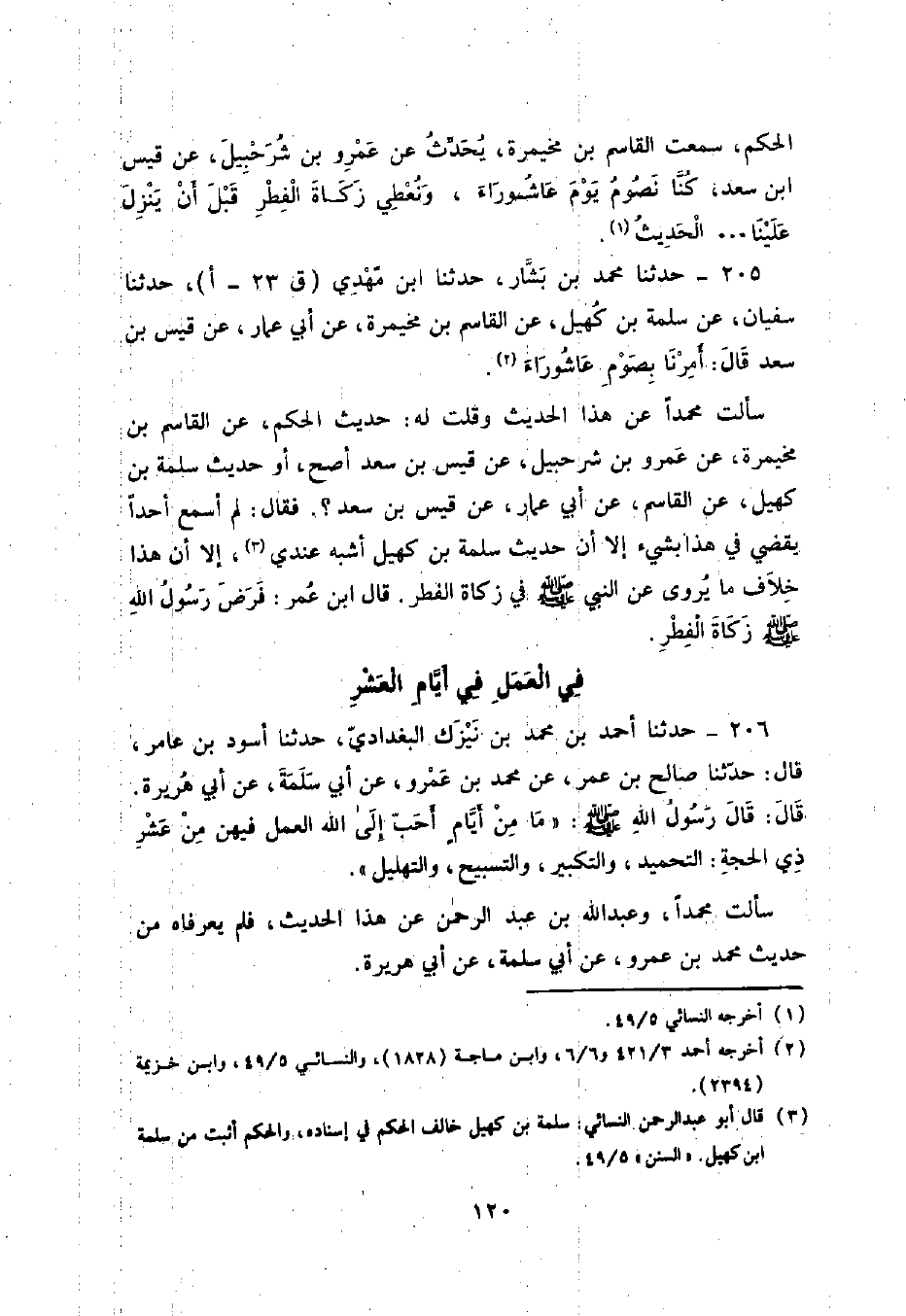 205 - حَدَّثَنَا مُحَمَّدُ بْنُ بَشَّارٍ , حَدَّثَنَا ابْنُ مَهْدِيٍّ , حَدَّثَنَا سُفْيَانُ , عَنْ سَلَمَةَ بْنِ كُهَيْلٍ , عَنِ الْقَاسِمِ بْنِ مُخَيْمِرَةَ , عَنْ أَبِي عَمَّارٍ , عَنْ قَيْسِ بْنِ سَعْدٍ , قَالَ: §أُمِرْنَا بِصَوْمِ عَاشُورَاءَ , سَأَلْتُ مُحَمَّدًا عَنْ هَذَا الْحَدِيثِ وَقُلْتُ لَهُ: حَدِيثُ الْحَكَمِ عَنِ الْقَاسِمِ بْنِ مُخَيْمِرَةَ , عَنْ عَمْرِو بْنِ شُرَحْبِيلَ , عَنْ قَيْسِ بْنِ سَعْدٍ أَصَحُّ أَوْ حَدِيثُ سَلَمَةَ بْنِ كُهَيْلٍ , عَنِ الْقَاسِمِ , عَنْ أَبَى عَمَّارٍ , عَنْ قَيْسِ بْنِ سَعْدٍ فَقَالَ: لَمْ أَسْمَعْ أَحَدًا يَقْضِي فِي هَذَا بِشَيْءٍ , إِلَّا أَنَّ حَدِيثَ سَلَمَةَ بْنِ كُهَيْلٍ أَشْبَهُ عِنْدِي , إِلَّا أَنَّ هَذَا خِلَافُ مَا يُرْوَى عَنِ النَّبِيِّ صَلَّى اللهُ عَلَيْهِ وَسَلَّمَ فِي زَكَاةِ الْفِطْرِ. قَالَ ابْنُ عُمَرَ: «فَرَضَ رَسُولُ اللَّهِ صَلَّى اللهُ عَلَيْهِ وَسَلَّمَ زَكَاةَ الْفِطْرِ»
