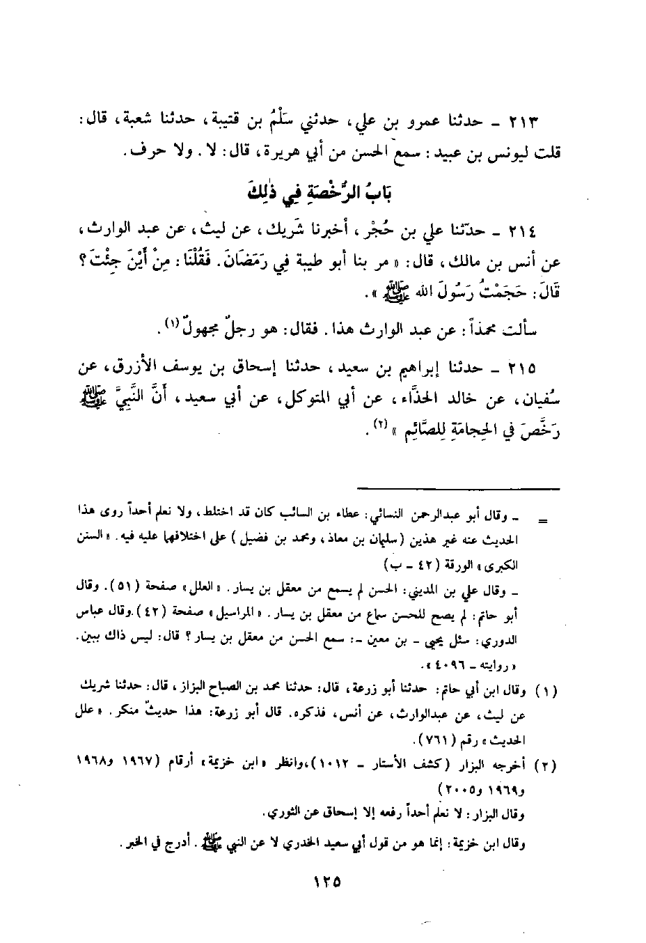 214 - حَدَّثَنَا عَلِيُّ بْنُ حُجْرٍ , أَخْبَرَنَا شَرِيكٌ , عَنْ لَيْثٍ , عَنْ عَبْدِ الْوَارِثِ , عَنْ أَنَسِ بْنِ مَالِكٍ , قَالَ: §مَرَّ بِنَا أَبُو طَيْبَةَ فِي رَمَضَانَ فَقُلْنَا: مِنْ أَيْنَ جِئْتَ؟ قَالَ: حَجَمْتُ رَسُولَ اللَّهِ صَلَّى اللهُ عَلَيْهِ وَسَلَّمَ , سَأَلْتُ مُحَمَّدًا عَنْ عَبْدِ الْوَارِثِ هَذَا فَقَالَ: هُوَ رَجُلٌ مَجْهُولٌ