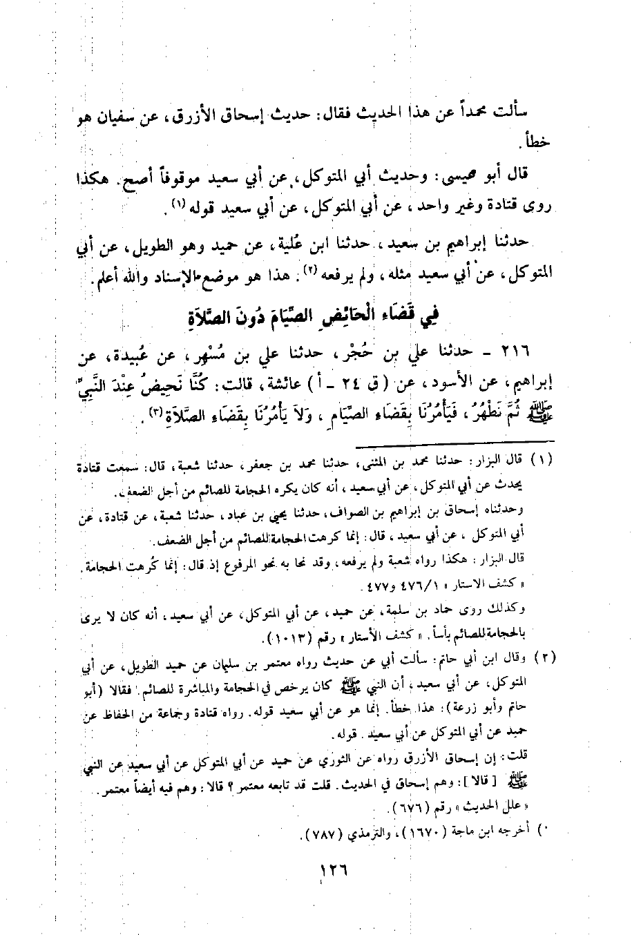 216 - حَدَّثَنَا عَلِيُّ بْنُ حُجْرٍ , حَدَّثَنَا عَلِيُّ بْنُ مُسْهِرٍ , عَنْ عُبَيْدَةَ , عَنْ إِبْرَاهِيمَ , عَنِ الْأَسْوَدِ , عَنْ عَائِشَةَ , قَالَتْ: §كُنَّا نَحِيضُ عِنْدَ النَّبِيِّ صَلَّى اللهُ عَلَيْهِ وَسَلَّمَ ثُمَّ نَطْهُرُ فَيَأْمُرُنَا بِقَضَاءِ الصِّيَامِ وَلَا يَأْمُرُنَا بِقَضَاءِ الصَّلَاةِ سَأَلْتُ مُحَمَّدًا عَنْ هَذَا الْحَدِيثِ فَقَالَ: أَرْجُو أَنْ يَكُونَ مَحْفُوظًا , قَالَ مُحَمَّدٌ: وَعُبَيْدَةُ بْنُ مُعَتِّبٍ الضَّبِّيُّ يُكْنَى: أَبَا عَبْدِ الْكَرِيمِ وَهُوَ قَلِيلُ الْحَدِيثِ وَأَنَا أَرْوِي عَنْهُ