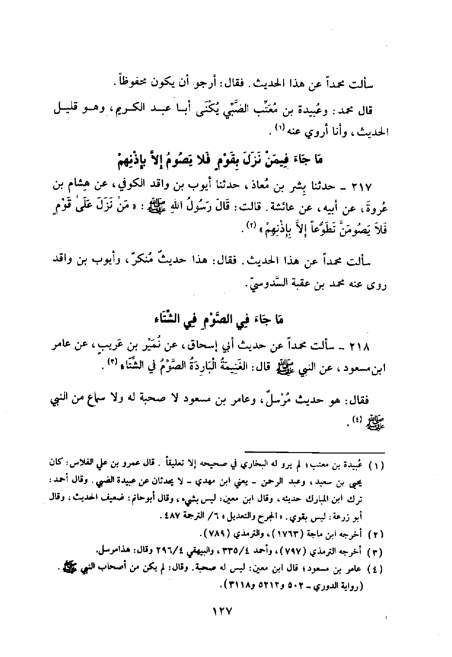 217 - حَدَّثَنَا بِشْرُ بْنُ مُعَاذٍ , حَدَّثَنَا أَيُّوبُ بْنُ وَاقِدٍ الْكُوفِيُّ , عَنْ هِشَامِ بْنِ عُرْوَةَ , عَنْ أَبِيهِ , عَنْ عَائِشَةَ , قَالَتْ: قَالَ رَسُولُ اللَّهِ صَلَّى اللهُ عَلَيْهِ وَسَلَّمَ: «§مَنْ نَزَلَ عَلَى قَوْمٍ فَلَا يَصُومَنَّ تَطَوُّعًا إِلَّا بِإِذْنِهِمْ» . سَأَلْتُ مُحَمَّدًا عَنْ هَذَا الْحَدِيثِ فَقَالَ: هَذَا حَدِيثٌ مُنْكَرٌ , وَأَيُّوبُ بْنُ وَاقِدٍ رَوَى عَنْهُ مُحَمَّدُ بْنُ عُقْبَةَ السَّدُوسِيُّ