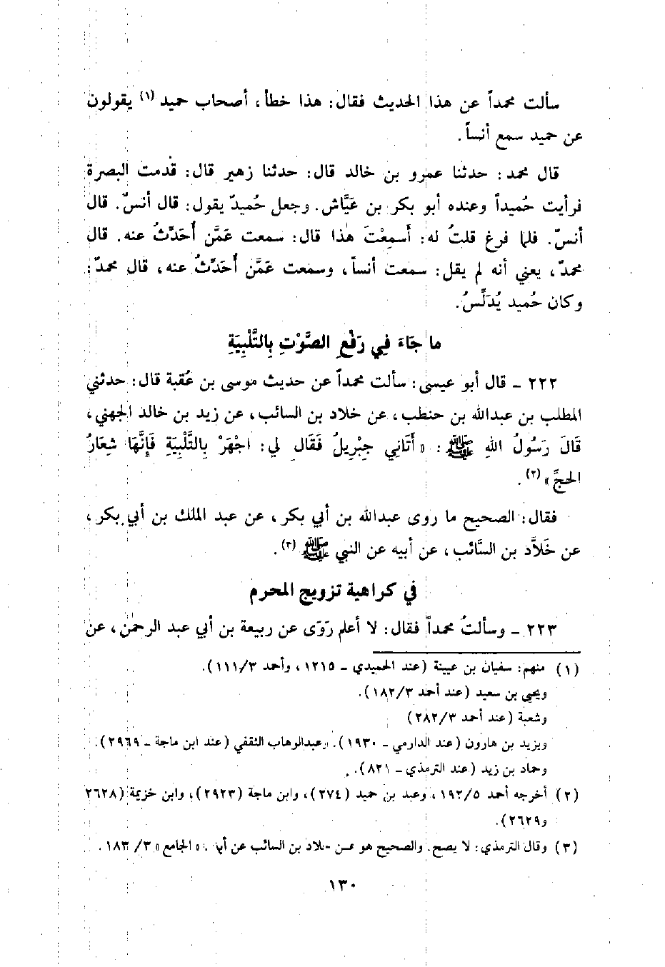 222 - قَالَ أَبُو عِيسَى: سَأَلْتُ مُحَمَّدًا عَنْ حَدِيثِ مُوسَى بْنِ عُقْبَةَ قَالَ: حَدَّثَنِي الْمُطَّلِبُ بْنُ عَبْدِ اللَّهِ بْنِ حَنْطَبٍ , عَنْ خَلَّادِ بْنِ السَّائِبِ , عَنْ زَيْدِ بْنِ خَالِدٍ الْجُهَنِيُّ , قَالَ رَسُولُ اللَّهِ صَلَّى اللهُ عَلَيْهِ وَسَلَّمَ: " أَتَانِي جِبْرِيلُ فَقَالَ لِيَ: اجْهَرْ بِالتَّلْبِيَةِ فَإِنَّهَا شِعَارُ الْحَجِّ ". فَقَالَ: الصَّحِيحُ مَا رَوَى عَبْدُ اللَّهِ بْنُ أَبِي بَكْرٍ , عَنْ عَبْدِ الْمَلِكِ بْنِ أَبِي بَكْرٍ , عَنْ خَلَّادِ بْنِ السَّائِبِ , عَنْ أَبِيهِ , عَنِ النَّبِيِّ صَلَّى اللهُ عَلَيْهِ وَسَلَّمَ