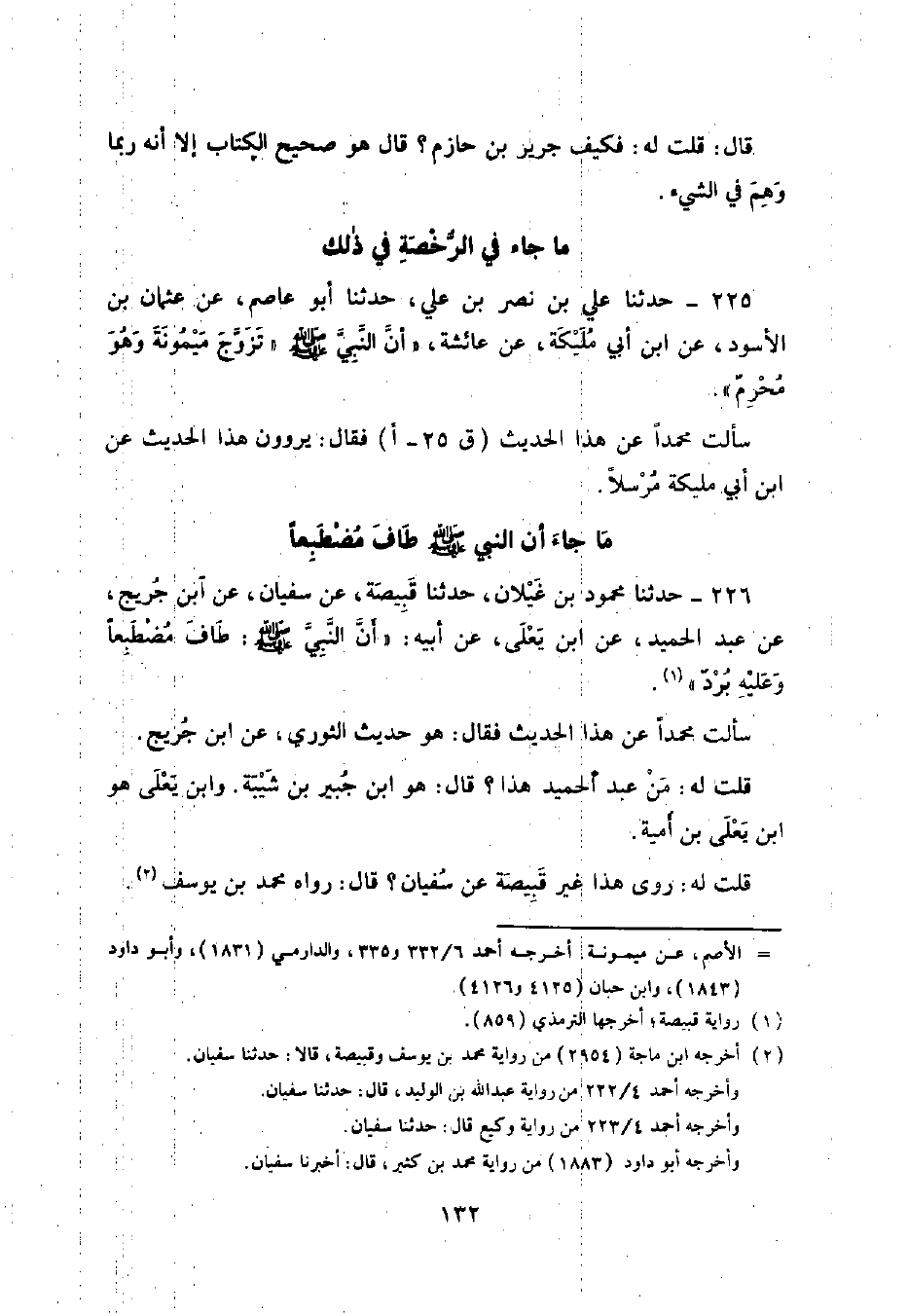 226 - حَدَّثَنَا مَحْمُودُ بْنُ غَيْلَانَ , حَدَّثَنَا قَبِيصَةُ , عَنْ سُفْيَانَ , عَنِ ابْنِ جُرَيْجٍ , عَنْ عَبْدِ الْحَمِيدِ , عَنْ ابْنِ يَعْلَى , عَنْ أَبِيهِ , أَنَّ النَّبِيَّ صَلَّى اللهُ عَلَيْهِ وَسَلَّمَ §طَافَ مُضْطَبِعًا وَعَلَيْهِ بُرْدٌ. سَأَلْتُ مُحَمَّدًا عَنْ هَذَا الْحَدِيثِ فَقَالَ: هُوَ حَدِيثُ الثَّوْرِيِّ , عَنْ ابْنِ جُرَيْجٍ. قُلْتُ لَهُ: مَنْ عَبْدُ الْحَمِيدِ هَذَا؟ قَالَ: هُوَ ابْنُ جُبَيْرِ بْنِ شَيْبَةَ , وَابْنُ يَعْلَى هُوَ ابْنُ يَعْلَى بْنِ أُمَيَّةَ. قُلْتُ لَهُ: رَوَى هَذَا غَيْرُ قَبِيصَةَ عَنْ سُفْيَانَ؟ قَالَ: رَوَاهُ مُحَمَّدُ بْنُ يُوسُفَ