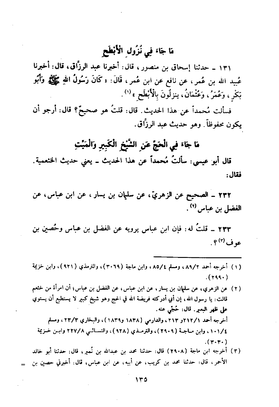 231 - حَدَّثَنَا إِسْحَاقُ بْنُ مَنْصُورٍ , قَالَ: أَخْبَرَنَا عَبْدُ الرَّزَّاقِ , قَالَ: أَخْبَرَنَا عُبَيْدُ اللَّهِ بْنُ عُمَرَ , عَنْ نَافِعٍ , عَنِ ابْنِ عُمَرَ , قَالَ: كَانَ رَسُولُ اللَّهِ صَلَّى اللهُ عَلَيْهِ وَسَلَّمَ وَأَبُو بَكْرٍ وَعُمَرُ وَعُثْمَانُ §يَنْزِلُونَ بِالْأَبْطَحِ , فَسَأَلْتُ مُحَمَّدًا عَنْ هَذَا الْحَدِيثِ قَالَ: قُلْتُ هُوَ صَحِيحٌ؟ قَالَ: أَرْجُو أَنْ يَكُونَ مَحْفُوظًا , وَهُوَ حَدِيثُ عَبْدِ الرَّزَّاقِ
