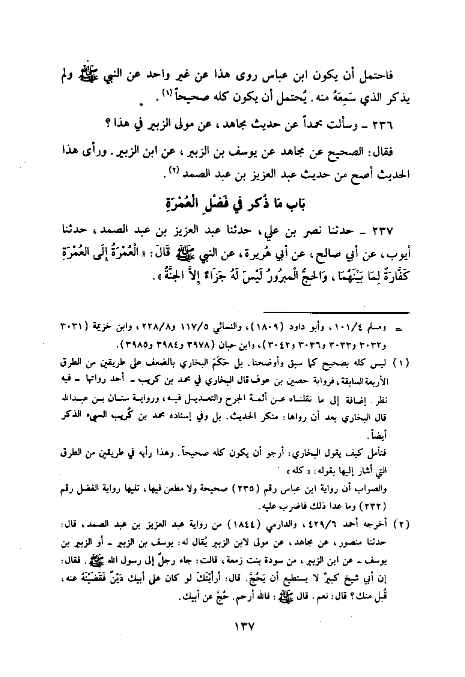 237 - حَدَّثَنَا نَصْرُ بْنُ عَلِيٍّ , حَدَّثَنَا عَبْدُ الْعَزِيزِ بْنُ عَبْدِ الصَّمَدِ , حَدَّثَنَا أَيُّوبُ , عَنْ أَبِي صَالِحٍ , عَنْ أَبَى هُرَيْرَةَ , عَنِ النَّبِيِّ صَلَّى اللهُ عَلَيْهِ وَسَلَّمَ قَالَ: «§الْعُمْرَةُ إِلَى الْعُمْرَةِ كَفَّارَةٌ لَمَّا بَيْنَهُمَا , وَالْحَجُّ الْمَبْرُورُ لَيْسَ لَهُ جَزَاءٌ إِلَّا الْجَنَّةُ» . سَأَلْتُ مُحَمَّدًا عَنْ هَذَا الْحَدِيثِ فَقَالَ: مَا أَرَى أَيُّوبَ سَمِعَ مِنَ أَبِي صَالِحٍ , قَالَ أَبُو عِيسَى: وَالْمَشْهُورُ عِنْدَ النَّاسِ عَنْ سُمَيٍّ , عَنْ أَبِي صَالِحٍ , عَنْ أَبِي هُرَيْرَةَ , عَنِ النَّبِيِّ صَلَّى اللهُ عَلَيْهِ وَسَلَّمَ رَوَاهُ سُهَيْلٌ وَالثَّوْرِيُّ وَمَالِكٌ وَغَيْرُ وَاحِدٍ , عَنْ سُمَيٍّ , عَنْ أَبِي صَالِحٍ , عَنْ أَبِي هُرَيْرَةَ