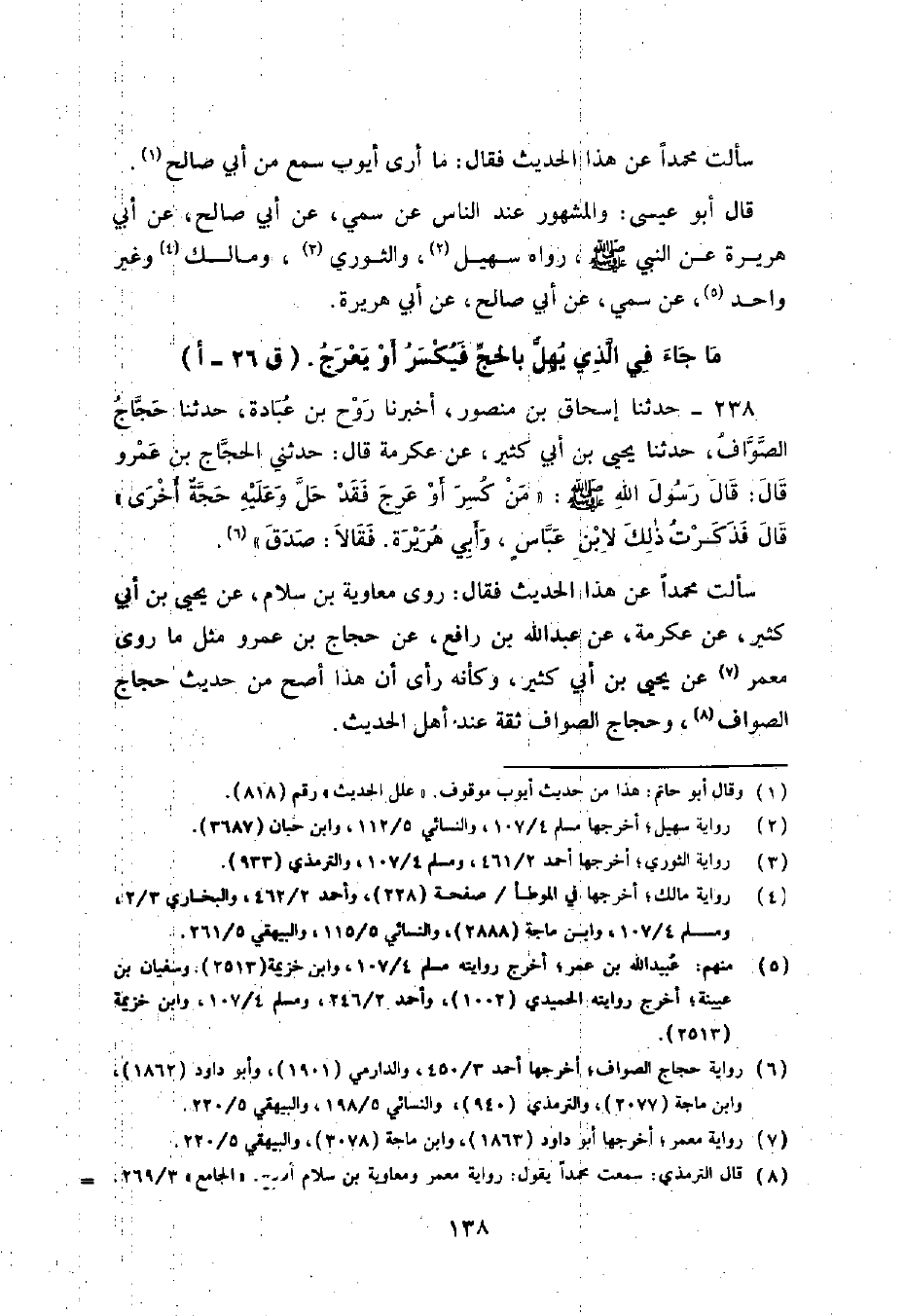 238 - حَدَّثَنَا إِسْحَاقُ بْنُ مَنْصُورٍ , أَخْبَرَنَا رَوْحُ بْنُ عُبَادَةَ , حَدَّثَنَا حَجَّاجُ الصَّوَّافُ , حَدَّثَنَا يَحْيَى بْنُ أَبِي كَثِيرٍ , عَنْ عِكْرِمَةَ , قَالَ: حَدَّثَنِي الْحَجَّاجُ بْنُ عَمْرٍو , قَالَ: قَالَ رَسُولُ اللَّهِ صَلَّى اللهُ عَلَيْهِ وَسَلَّمَ: «§مَنْ كُسِرَ أَوْ عُرِجَ فَقَدْ حَلَّ , وَعَلَيْهِ حَجَّةٌ أُخْرَى» قَالَ: فَذَكَرْتُ ذَلِكَ لِابْنِ عَبَّاسٍ , وَأَبِي هُرَيْرَةَ فَقَالَا: صَدَقَ. سَأَلْتُ مُحَمَّدًا عَنْ هَذَا الْحَدِيثِ فَقَالَ: رَوَى مُعَاوِيَةُ بْنُ سَلَّامٍ , عَنْ يَحْيَى بْنِ أَبِي كَثِيرٍ , عَنْ عِكْرِمَةَ , عَنْ عَبْدِ اللَّهِ بْنِ رَافِعٍ , عَنْ حَجَّاجِ بْنِ عَمْرٍو مِثْلَ مَا رَوَى مَعْمَرٌ , عَنْ يَحْيَى بْنِ أَبِي كَثِيرٍ , وَكَأَنَّهُ رَأَى أَنَّ هَذَا أَصَحُّ مِنْ حَدِيثِ حَجَّاجٍ الصَّوَّافِ , وَحَجَّاجُ الصَّوَّافُ ثِقَةٌ عِنْدَ أَهْلِ الْحَدِيثِ